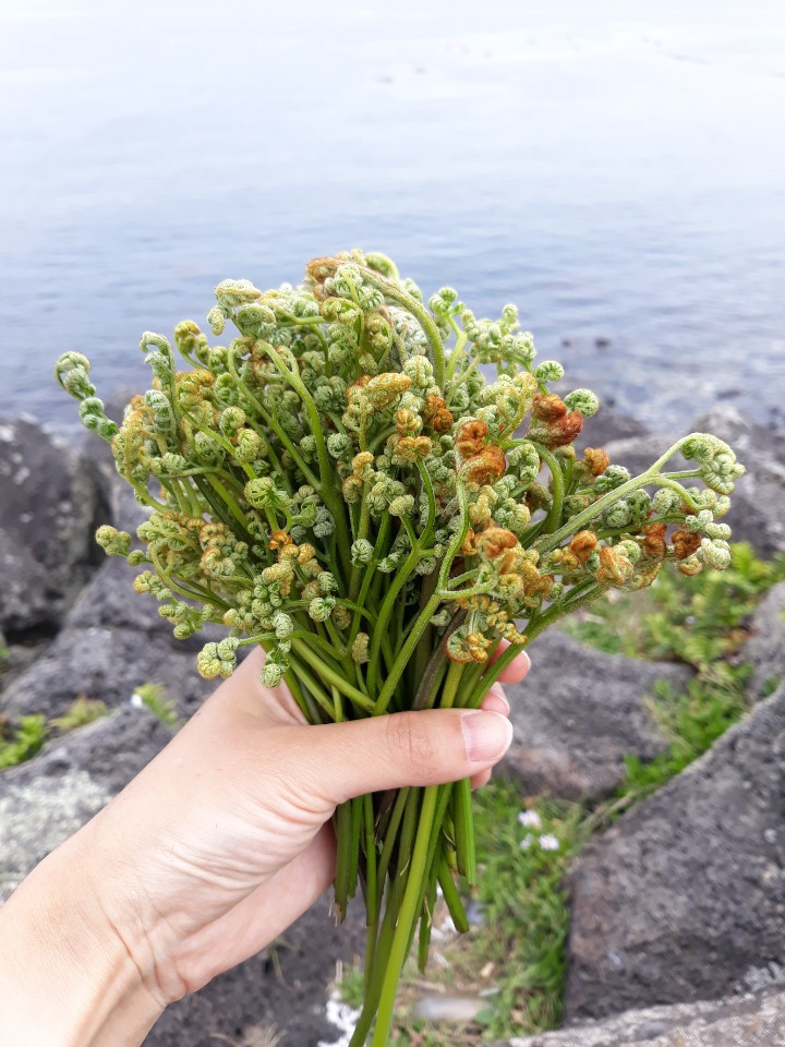 올레 16에서는 숨겨진 고사리 덤불을 발견하여 그 고사리를 따라가느라 걷는 시간이 엄청 지채 되었다. 잘 익은 고사리를 꺾을 때 줄기가 "톡톡톡" 부러지는 그 손맛을 잊을 수가 없다. (고사리를 얻고 다리에 풀독도 함께 얻었다.) 그리고 수산봉 정상에서 갑자기 만난 귀여운 아이(사슴인지 고라니인지 알 수가 없다.)는 나를 보고 한참이나 피하지 않는다.