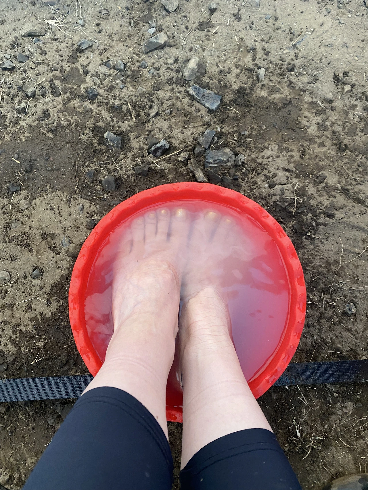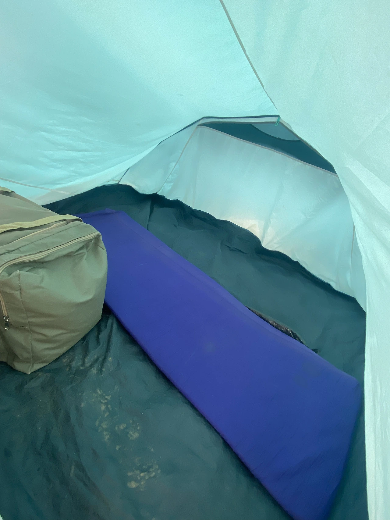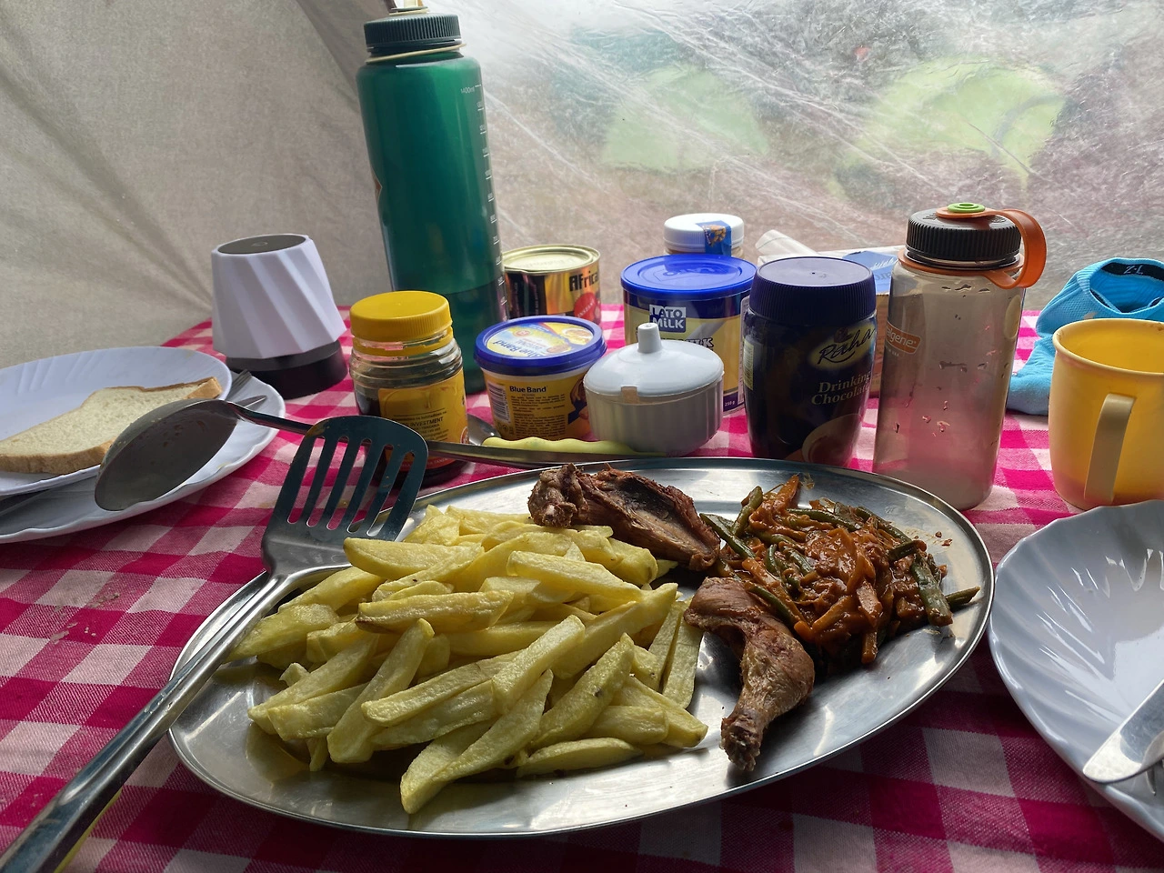 도착하여 텐트 안으로 들어가 보면 내 짐가방이 텐트 한편에 있고 매트리스가 깔려있다. 아담이 빨간 대야에 뜨거운 물을 가져다줘서 족욕(?)을 하며 발 피로를 풀었고, 점심으로 나온 프라이드 치킨도 너무 맛있게 잘 먹었다. 그러고 달게 낮잠을 한숨 잤다.