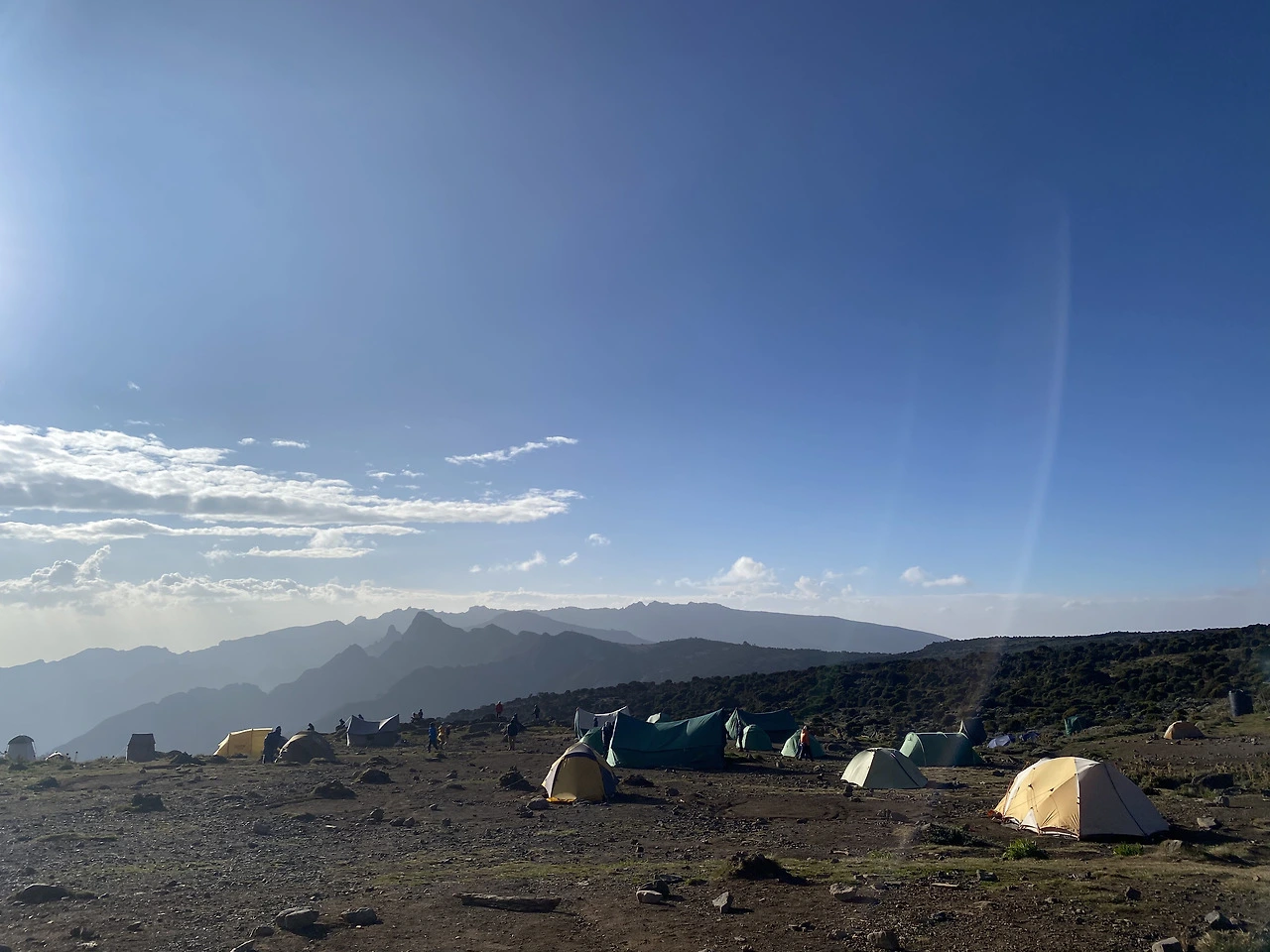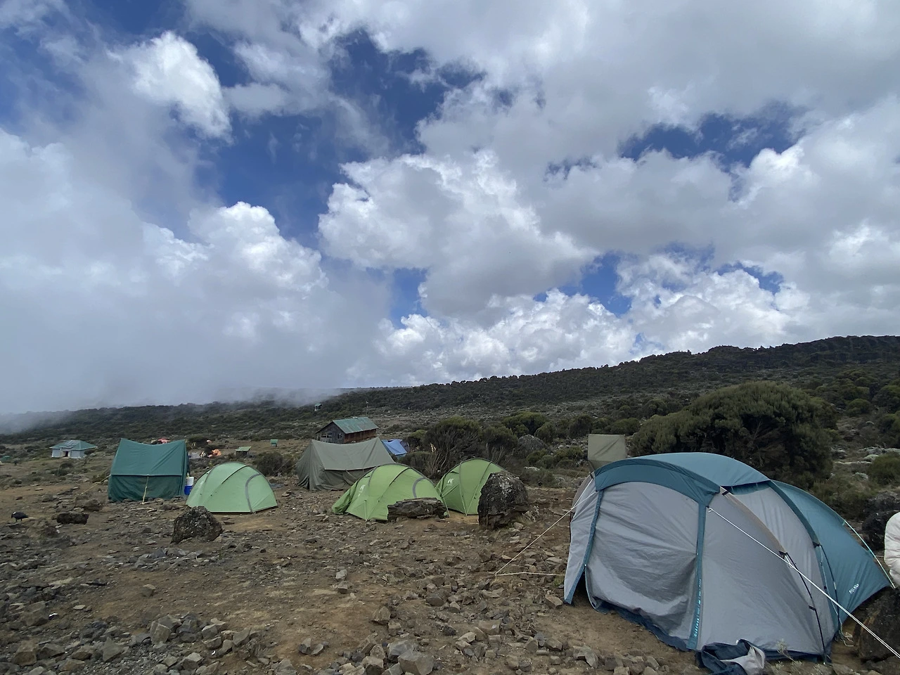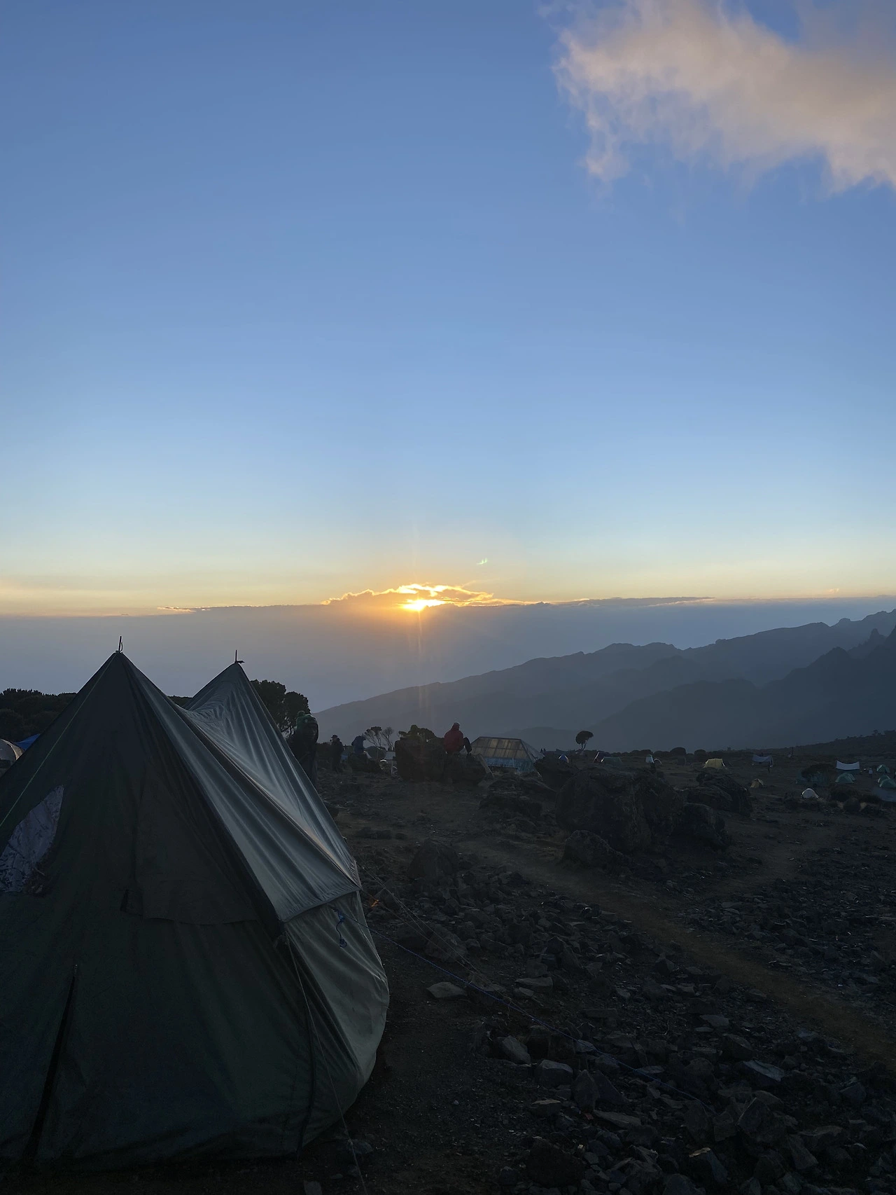 잠시 해가 쨍한 사이 내 텐트 뒤로 Uhuru peak(우후르 픽, 킬리만자로 정상)이 빼꼼히 모습을 살짝 드러낸다. 조금만 기다리고 있어! 곧 올라갈 테니. 겹겹이 쌓인 산 뒤로 해가 지고 바로 어둠이 몰려왔다.