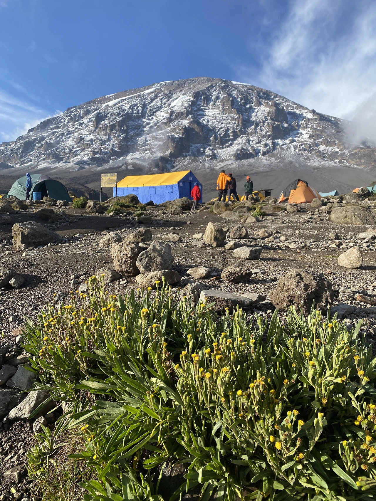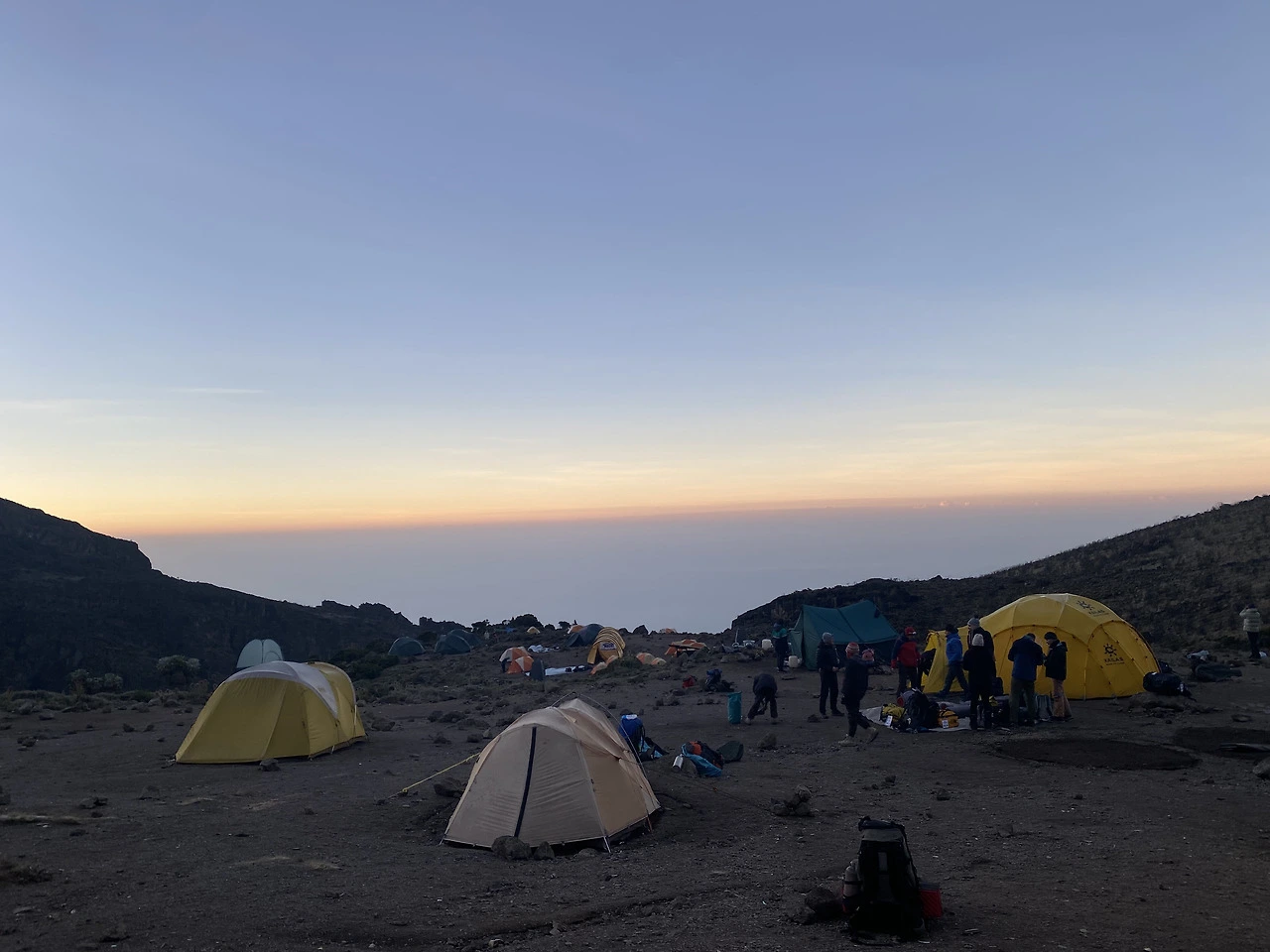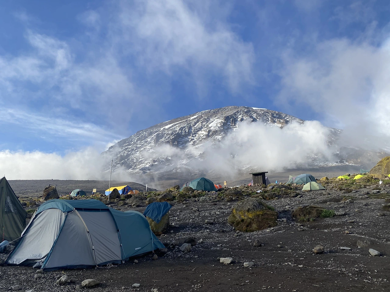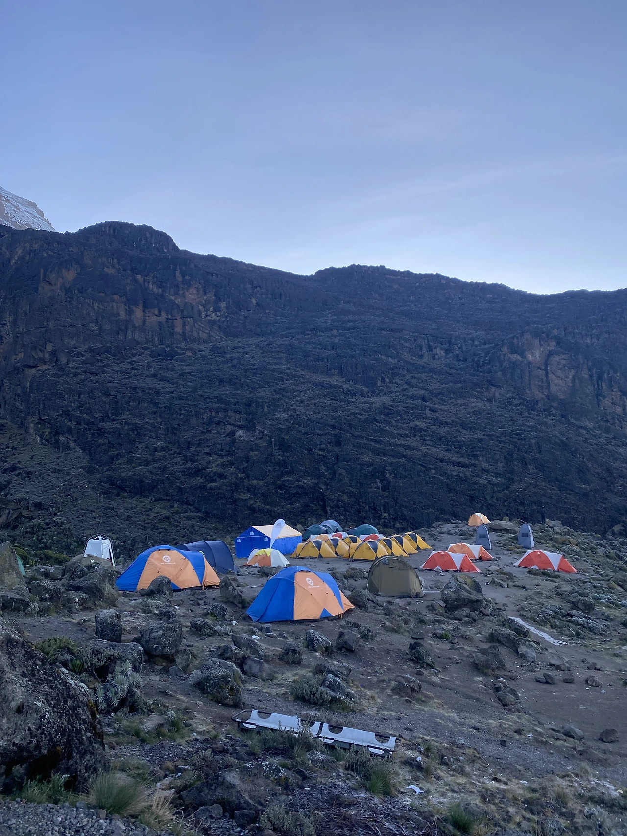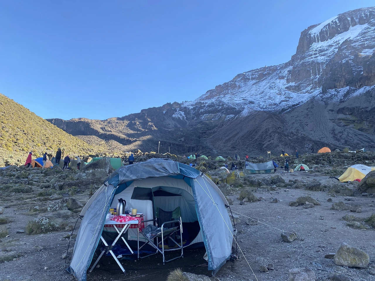 밤사이 바랑코 캠프에서는 비가 추적추적 많이 왔다. 텐트 안에서 빗소리를 듣는 건 낭만이지만 화장실을 가려면 정말 고역이다. 킬리만자로에 7일을 머무르면서 가장 좋았던 숙박지는 바랑코 캠프이다. 이름도 이쁘고 텐트 앞으로는 모쉬(Moshi) 시내가 보이고, 뒤로는 설산이 권위롭게 자태를 뽐냈다.