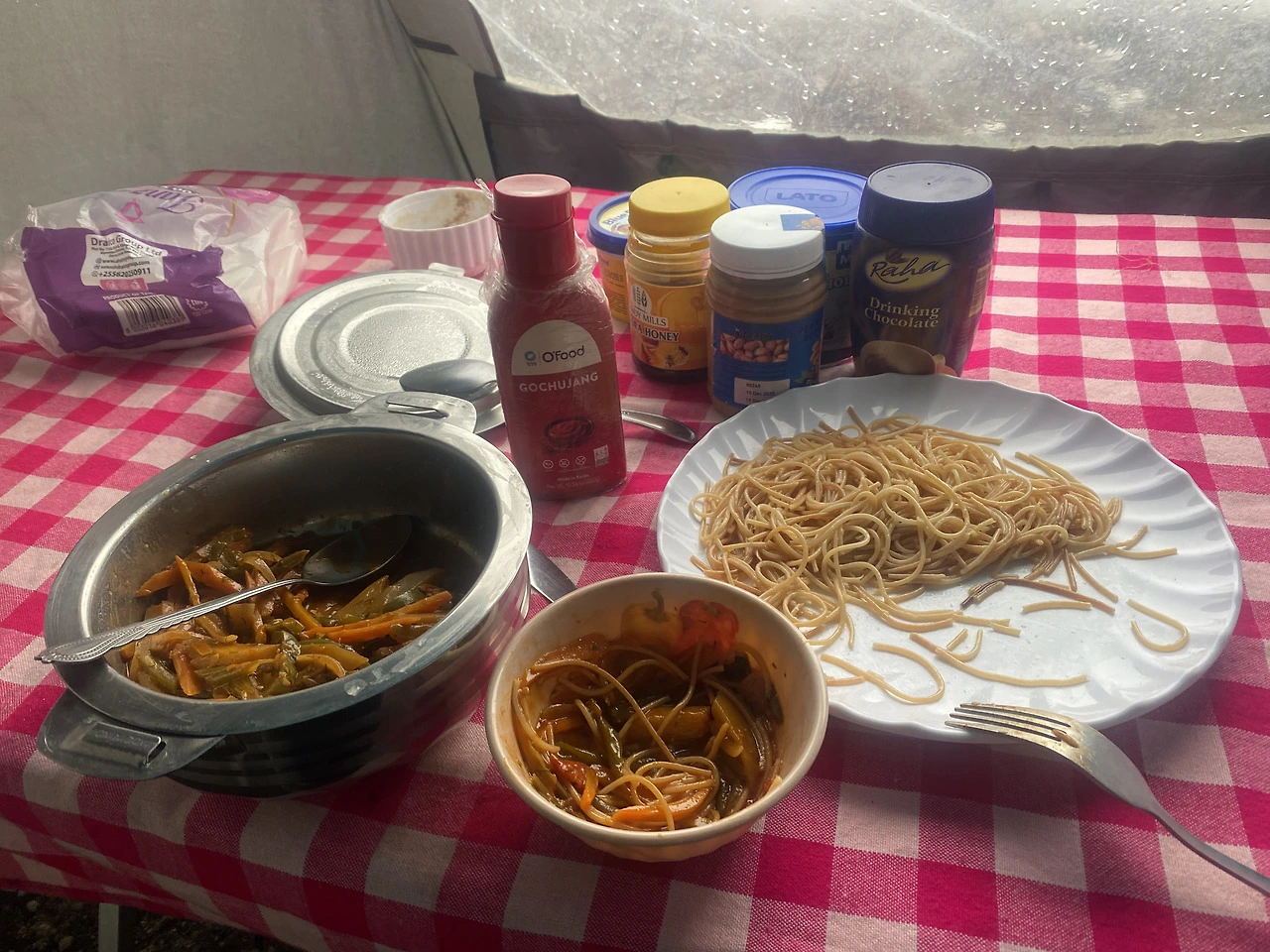 오후 6시쯤 저녁으로 나온 파스타 면에 가지고 온 고추장을 뿌려 한국식 비빔면을 만들어본다.