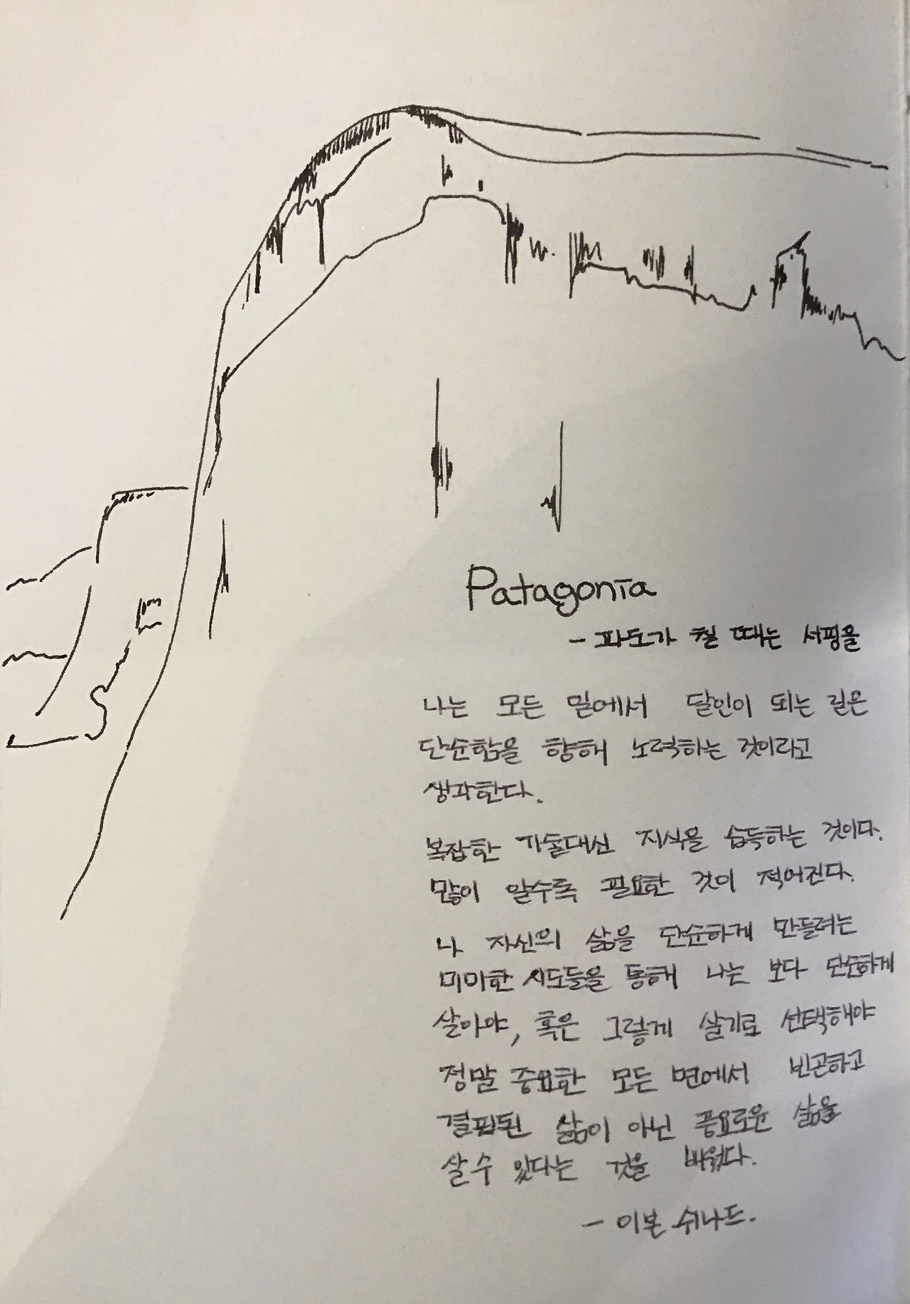 나는 모든 일에서 달인이 되는 길은 단순함을 향해 노력하는 것이라고 생각한다. 복잡한 기술 대신 지식을 습득하는 것이다. 많이 알수록 필요한 것이 적어진다. 나 자신의 삶을 단순하게 만들려는 미미한 시도들을 통해 나는 보다 단순하게 살아야, 혹은 그렇게 살기도 선택해야 정말 중요한 모든 면에서 빈곤하고 결핍된 삶이 아닌 풍요로운 삶을 살 수 있다는 것을 배웠다. - 파타고니아, 이본 쉬나드-