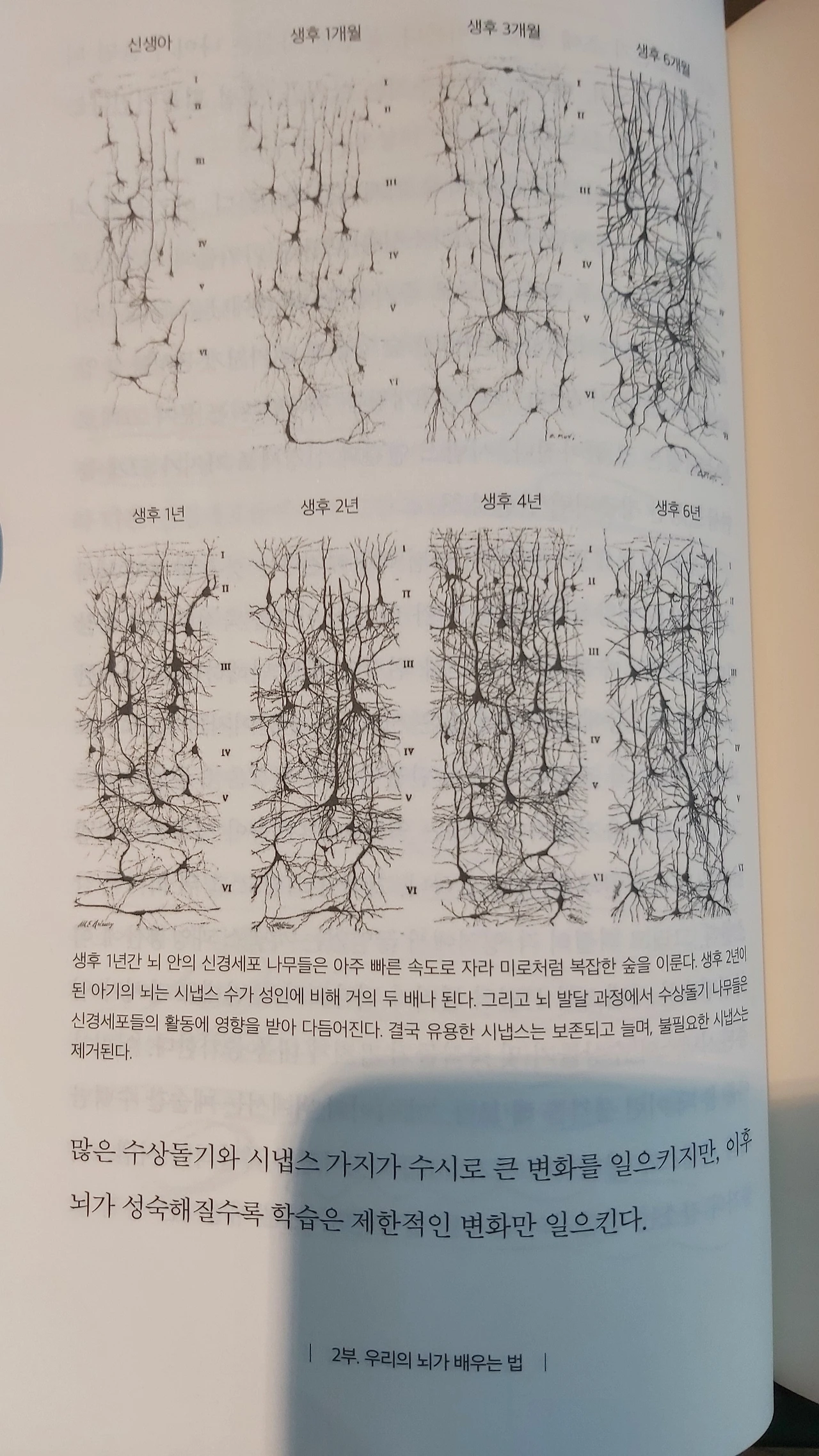 막 태어났을 때 유아의 피질은 허리케인이 휩쓸고 지나간 숲 같아서 여기저기 듬성듬성 앙상한 나무들만 서 있다. 그러나 6개월쯤 지나면 뇌는 문자 그대로 봄날을 맞은 것 같아진다. 시냅스 연결과 신경세포 가지가 크게 늘면서 울창한 정글처럼 변한다.