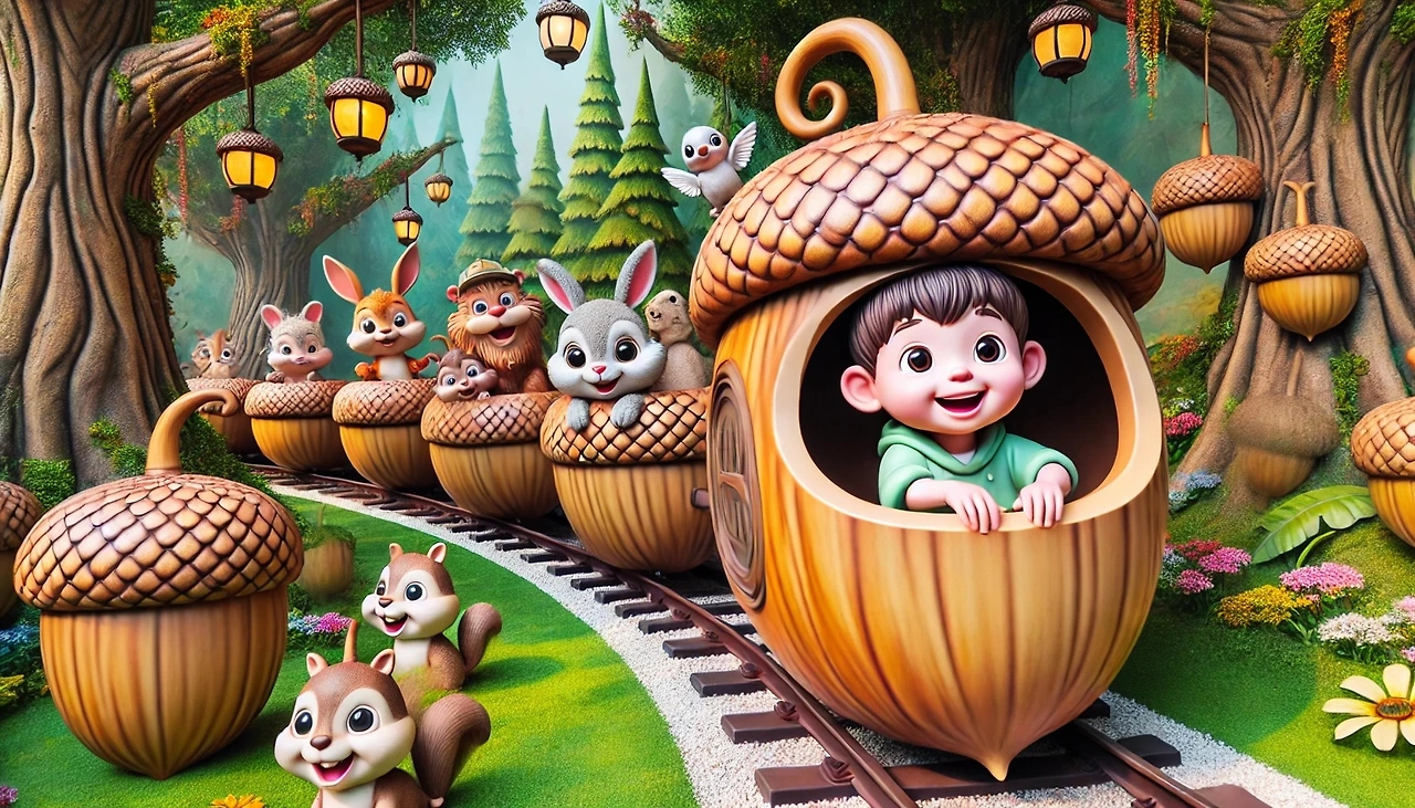 ⭐️⭐️이는 용감하게 도토리 기차에 올라탔어요. "이 도토리 기차는 어디로 가나요?" ⭐️⭐️이가 묻자, 기차는 부드럽게 움직이기 시작했어요. "이 도토리 기차는 모험과 재미로 가득한 도토리 숲으로 갑니다!" 기차가 대답했죠.