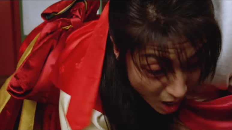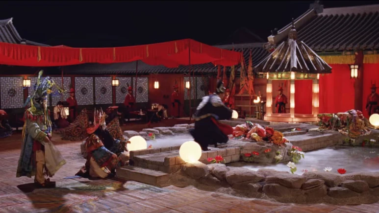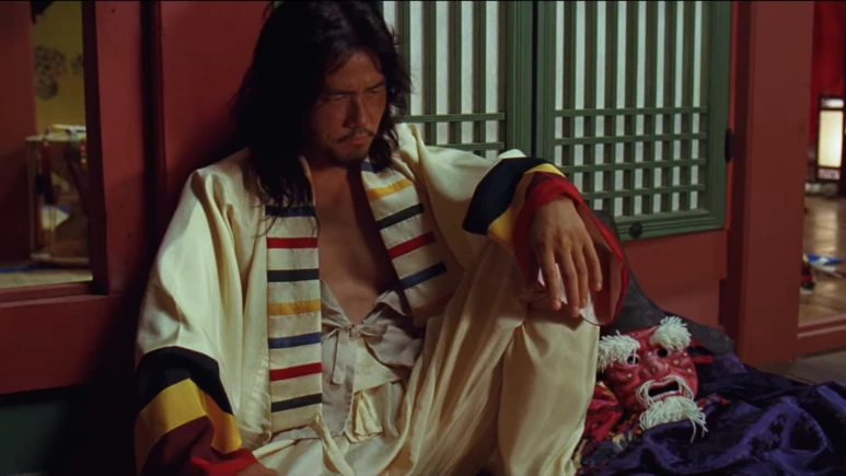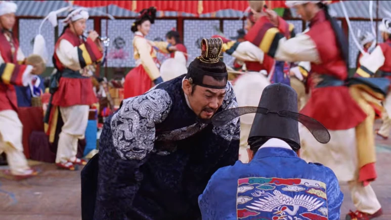 연산군의 어머니인 폐비 윤 씨의 이야기를 다룬 탈놀이를 경극 형식으로 진행하게 된다. 이때 폐비 윤 씨를 죽게 만든 엄 씨, 정 씨의 모습이 다루어지게 되는데 이게 연산군의 발작 버튼이 되어 연극을 보고 있던 두 사람 모두 칼로 찔러 죽이게 된다. 이때 죽이는 모습을 화면 가득하게 광기에 서린 연산군의 모습으로 채우고 죽는 모습은 소리로만 표현하는 게 새삼 충격이었다. 심지어 죽이고 난 후 꽂혀있는 칼 구도도 절묘해서 가장 마음에 들은 장면이었다.
