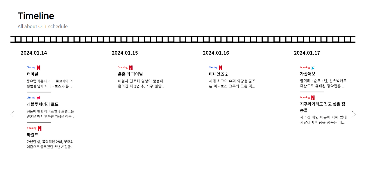 OTT ground는 각 OTT에서 가장 많이 본 TOP 10과 콘텐츠의 공개/ 종료 시점을 타임라인으로 모아둔 공간입니다.