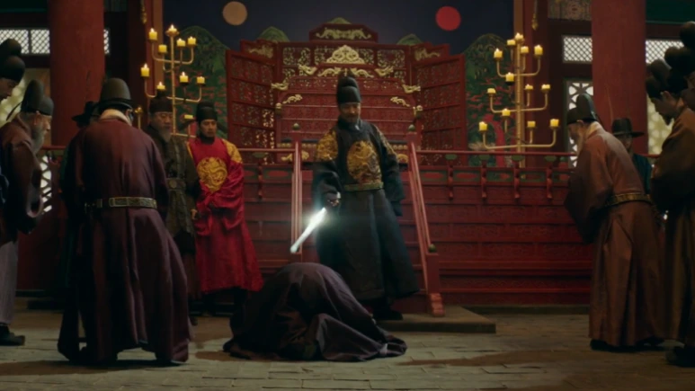 영화에서 세종이 자신이 자신의 아버지처럼 될까 봐 선왕(태종)의 곤룡포를 입기 무서워하는 모습을 보여주었는데 결국 그 곤룡포를 입으면서 떡밥을 회수하면서 본인이 꺼리던 선왕의 이미지처럼 욕을 쓰고, 칼을 들고 대신들을 공포에 떨게 만드는 모습이 우선 나한테는 당혹스럽고 늘 착한 이미지였는데 본능적으로 무섭다는 생각이 들었다.