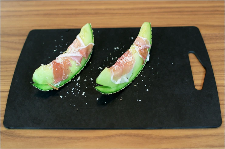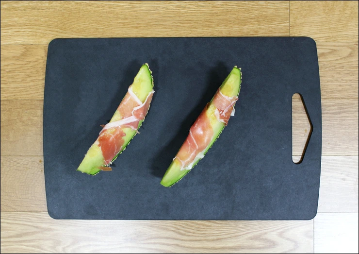 2. 발라낸 과육 부분에 하몽 또는 프로슈토 햄 1/2조각을 둘러준다