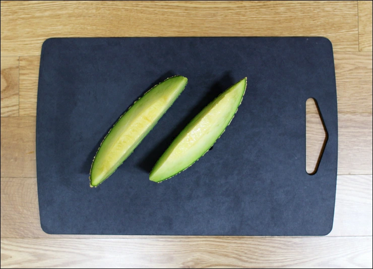 1. 멜론은 반으로 갈라 씨를 제거하고 얇게 썰은 뒤 껍질과 과육 칼로 발라낸다