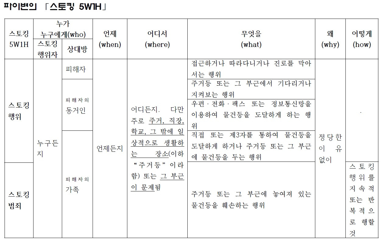 스토킹범죄= 스토킹행위(=상대방 의사에 반할 것+정당한 이유가 없을 것+ 상대방 또는 그의 동거인, 가족에 대하여 위 다섯 가지 행위 중 어느 하나 이상에 해당할 것)를 지속적 또는 반복적으로 행할 것
