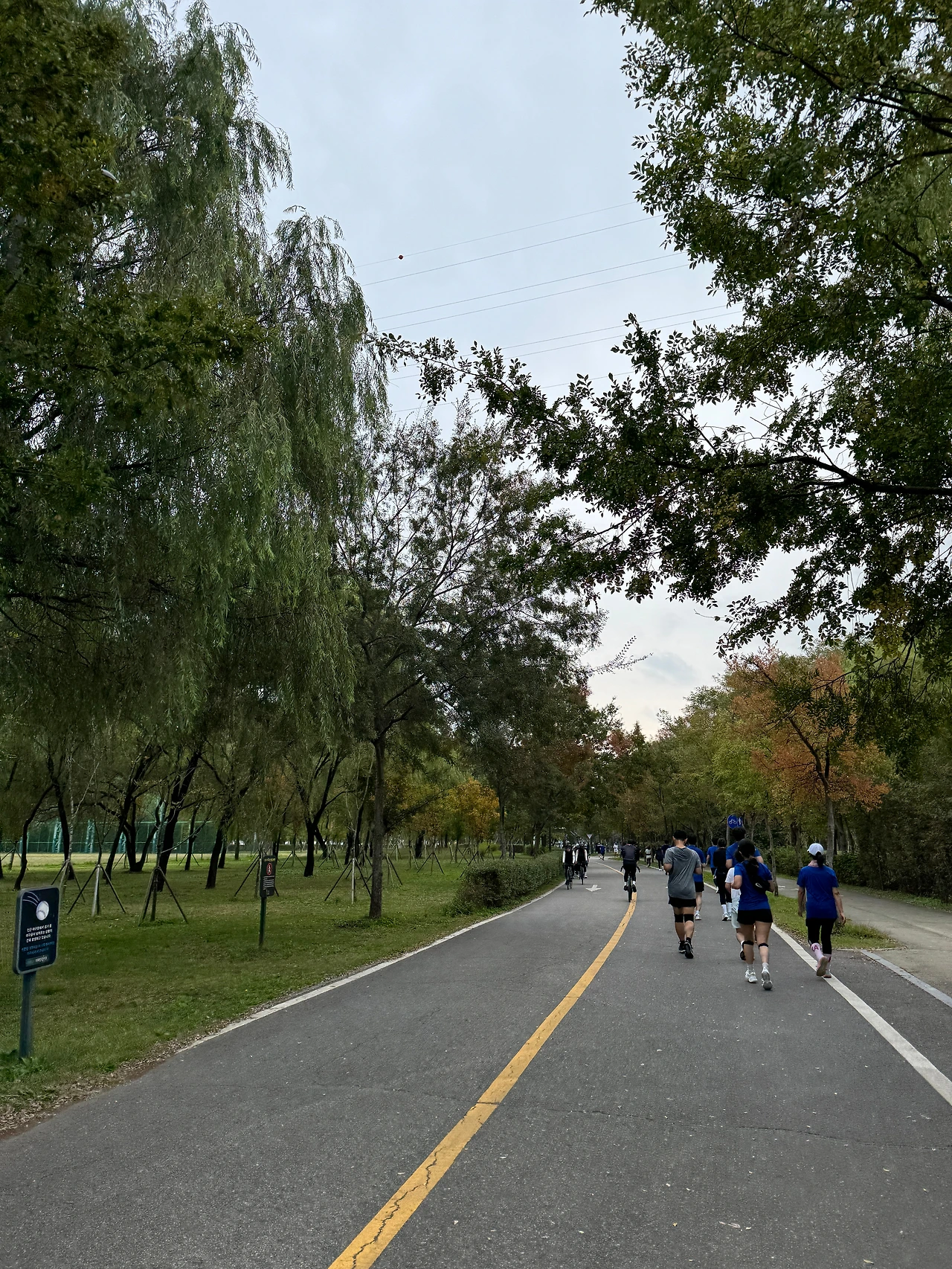 이런저런 생각을 했다가, 별생각 없이 머리를 비우고 달리기도 하고, 앞으로 달려 나갈 때는 보지 못했던 풍경을 눈에 담아도 본다. 잔디는 여전히 푸르지만 곳곳에 누런 기운이 감돌고, 사이프러스 나무들도 아직 붉게 물들기 전이라 짙푸른 빛으로 드문드문 서 있다. 한강변을 달리는 줄 알았는데 코스가 좀 바뀌었다더니 성산대교의 붉은색 트러스가 언뜻 보여서 한강 옆이구나, 하고 알 수는 있지만 강물은 아주 빼꼼히 보일 뿐이다. 그 사이 7km. 다리가 아프긴 하지만 무릎은 다행히 아직 괜찮다.