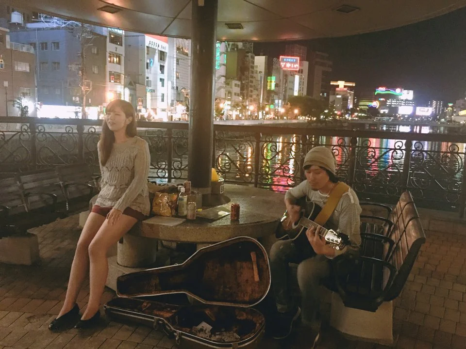 보컬과 기타 두 명으로 구성된 이 팀은 현재 앨범을 준비 중이라고 했다. 서울에 가본 적이 있다는 보컬은 동대문의 옷이 너무 비싸다고 했다. 내가 한국 사람들은 이제 동대문에 가지 않는다고 말했더니 역시 그럴 줄 알았다며 아쉬워했다. 일본에는 많은 아티스트들이 거리 공연을 일상적으로 한다고 했다. 많은 사람들이 스스럼없이 다가와 이야기를 하고 공연 도중에 멈추어서서 잔을 나누기도 했다. 우리나라의 버스킹 문화와는 다르게 정확한 시간에 나누어져 버스킹을 하고 있다고 한다. 다른 팀의 공연을 방해하지 않기 위해 앰프는 사용하지 않고 오로지 기타와 목소리만으로 공연을 하는 게 매너라고 했다. 지금은 이 다리 위에서 노래하지만 언젠가는 큰 공연장에서 노래할 거라고 하며 그때 되면 초대할 테니 꼭 연락하라고 했다. 나는 이 밴드가 크게 될 거라고 믿어 의심치 않는다.