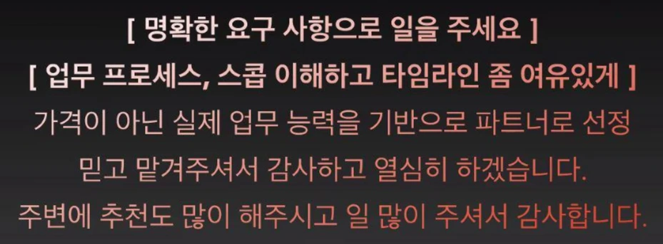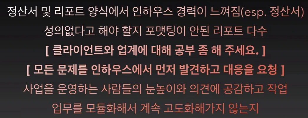 인하우스에게 바라는 것으론 좀 더 가이드라인이나 현황을 디테일하게 공유받고자 하는 니즈가 있었습니다. 더하여 프로세스, 스콥에 대한 이해를 하고 타임라인을 조율하고자 하는 니즈가 있는 편입니다.