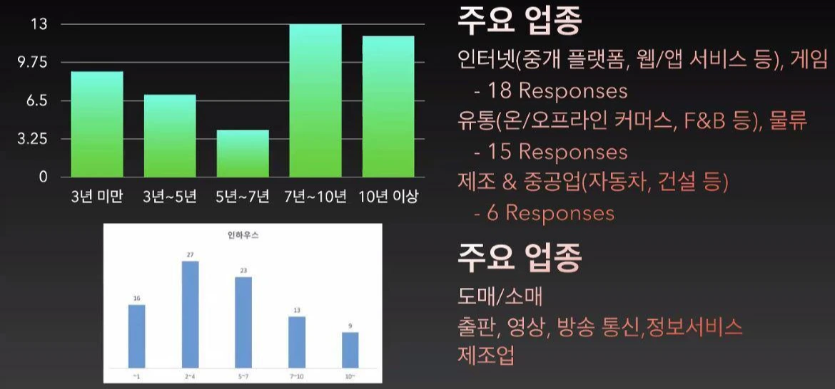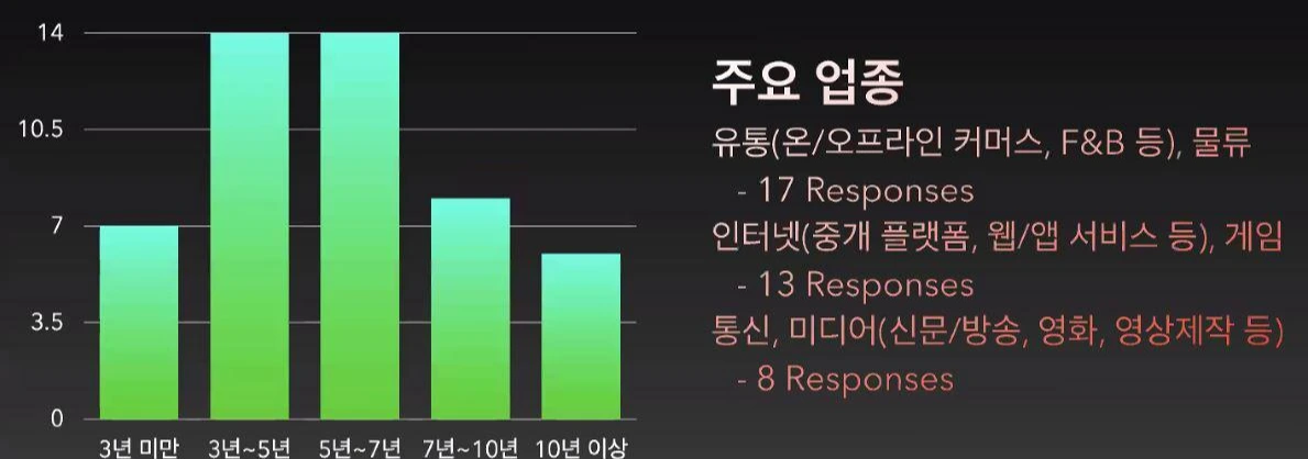 응답자의 경력 분포는 주로 7년차 이상이 상당부분 되었습니다. 산업군의 경우 인터넷 업종들이 상당부분 차지한 것을 볼 수 있습니다.