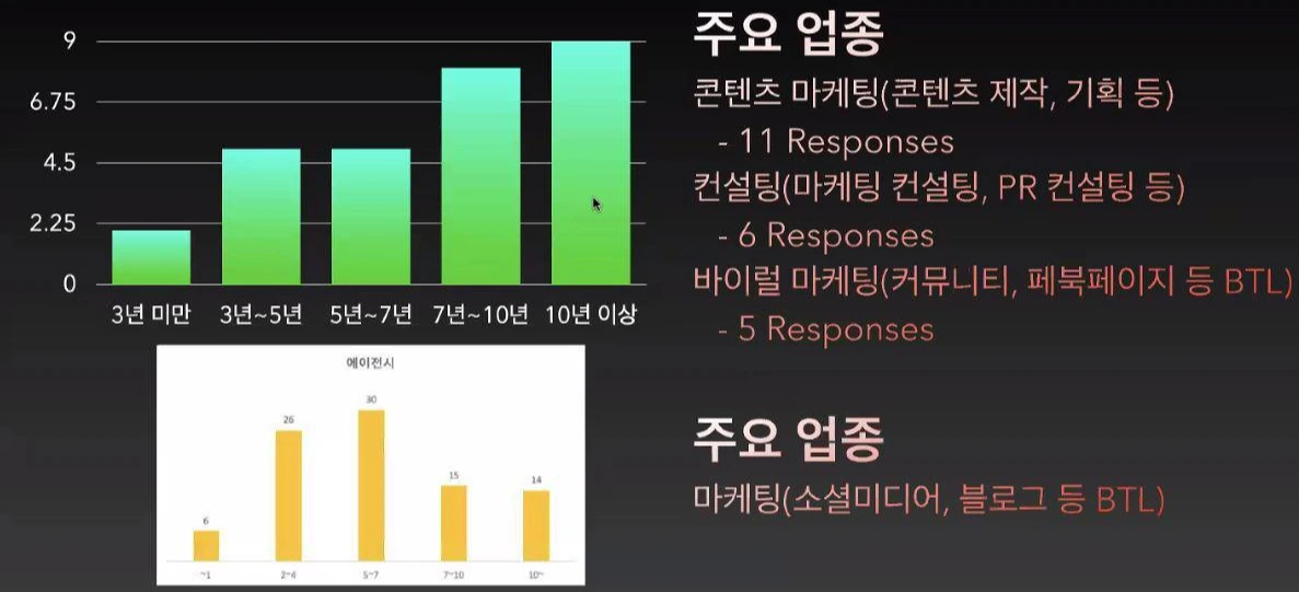 에이전시의 경우, 컨텐츠마케팅이 제일 많았습니다.(2016년도에는 BTL위주의 마케팅이 많았음) 그리고 연차는 2016 응답자 대비 점차적으로 누적연차가 많은 분포를 보이고 있습니다.