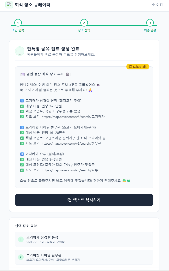 1조 : 블로그 날짜만 고르면 카카오톡 문안 5개 제안2조 : 회의보고, 대표보고