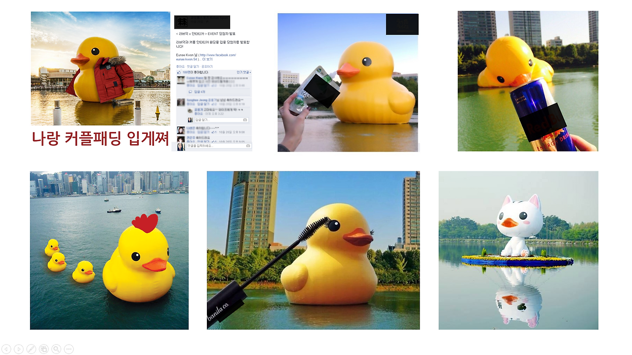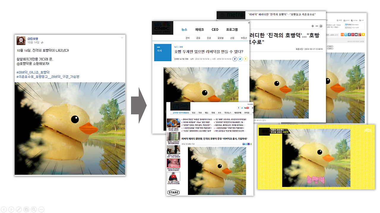 애자일 마케팅 전략에 대해 많이들 얘기 하시는데요, SNS는 특히 이와 같은 포맷과 깊게 연관될 수 밖에 없는 플랫폼이라는 것은 많이들 공감하시고 또 사용하고 있다고 봅니다. 예를 들어 대중이 주목할만한 이슈가 생기면 마케터들은 즉시 현장 취재를 하거나 제품을 이용해서 즉석에서 패러디하거나 합니다. 대표적인 예로, 실시간으로 수많은 패러디물을 양산했던 석촌호수의 러버덕이 그 사례 중 하나입니다.