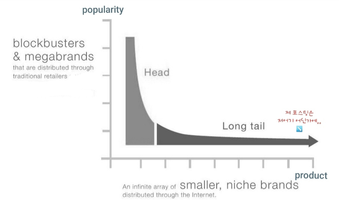 사진이라는 분야가 예전에는 전문 장비를 가진 일부의 전문가들만 생산 활동을 할 수 있는 고유의 영역이었다면, 이제는 예전 그 시대의 전문가들보다 더 좋은 사진기를 누구나 한 손에 들고 다니는 시대가 되어 저와 같은 사진 문외한들도 손쉽게 생산자로 참여할 수가 있게 되었습니다. 여전히 커다란 호응을 받는 대단한 사진들은 대포 같은 사이즈의 카메라 렌즈 등 엄청난 장비들을 구비하고, 촬영 이후에도 전문가의 노하우로 상당히 많은 공수가 투여된 작품이 대부분이지만, 세상은 꼭 그런 메이저만 필요로 하는 것은 아닙니다. 롱테일(Long Tail) 경제 이론에서 이것을 이해하기 쉽게 도식화했는데, 일부의 제품들은 아주 커다란 인기를 얻지만 그 외 무수한 다양한 제품들이 소소한 인기를 얻는 모습을 쉽게 볼 수 있습니다. 즉, 비주류 제품들이 다양하면 다양할수록 수는 적더라도 또 그것을 찾는 니치 마켓이 있고, 그만큼 더 넓고 다양한 부류의 사람에게 도달할 수 있는 것입니다. 롱테일의 꼬리가 길어지면 길어질수록 위에서 말했던 총'노출'이 증가한다는 뜻이고, 그 꼬리 연장의 역할을 하는 데에 제 미약하고 어설픈 사진으로라도, 그것이 겨우 망망대해의 물 한 방울 정도일 지라도, 보태겠다는 것입니다.