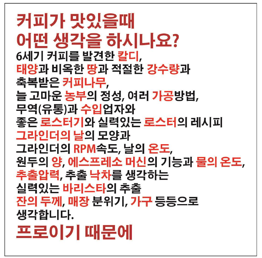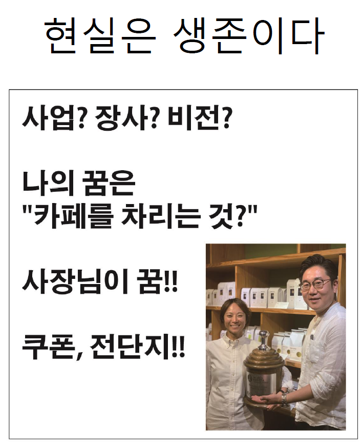 커피 한 잔을 마실 때도 커피랑 관련된 온갖 생각을 한다. 김기일 대표님에겐 커피는 단순히 '여유있는 한 모금'이 되기 어렵다. 그는 커피업계에 종사하는, 커피를 사랑하는 '프로'이기 때문이다. 그래서 창업을 해서 실패하고도 다시 일어나 커피랑 관련된 일을 찾는다. '진짜' 좋아해야만 가능한 일이며, '진짜' 좋아해서 버틸 수 있다면 창업을 해볼 수 있을 것이라 이야기한다. 하지만 그냥 '한 번 해볼까?' 가지고는 어림없다. 왜냐하면 현실은 생존이기 때문이다. 사장님이 꿈이라면 가슴 속에 항상 쿠폰과 전단지를 챙겨 다닐 것. 대표님이 된다는 것은 그냥 열정만으로는 힘들다는 것이다.