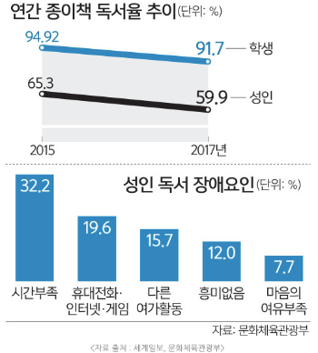 07년 76.6%에 달하던 성인 종이책 독서율이 59.9%로 떨어졌다. 무려 16.7%나 빠진 셈이다.