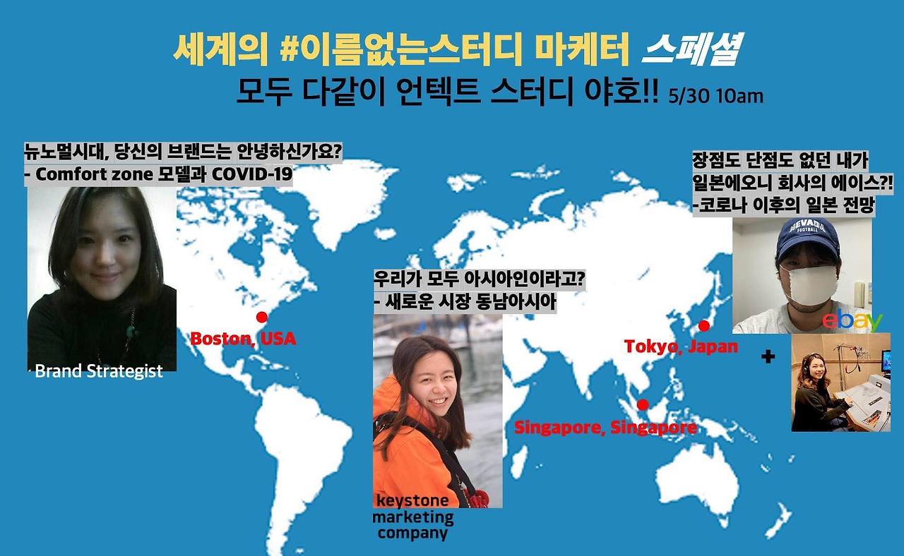 언콘택트 시대, 이름없는 스터디는 글로벌하게 스터디를 기획했다. 스터디를 시작한지 5년, 쌓여가는 시간만큼이나 세계 각국에서도 이름없는스터디 출신의 마케터들이 활동을 하고 있다. 그렇다. 이번에는 각국의 상황을 직접 들어보기로 했다. 코로나 19 사망자수가 10만명이 넘어가고 있는 미국, 코로나 모범국으로 평가받는 싱가포르, 긴급사태를 해제할 거라 예상되는 일본, 이렇게 3개국의 이야기를 생생하게 들어보자!