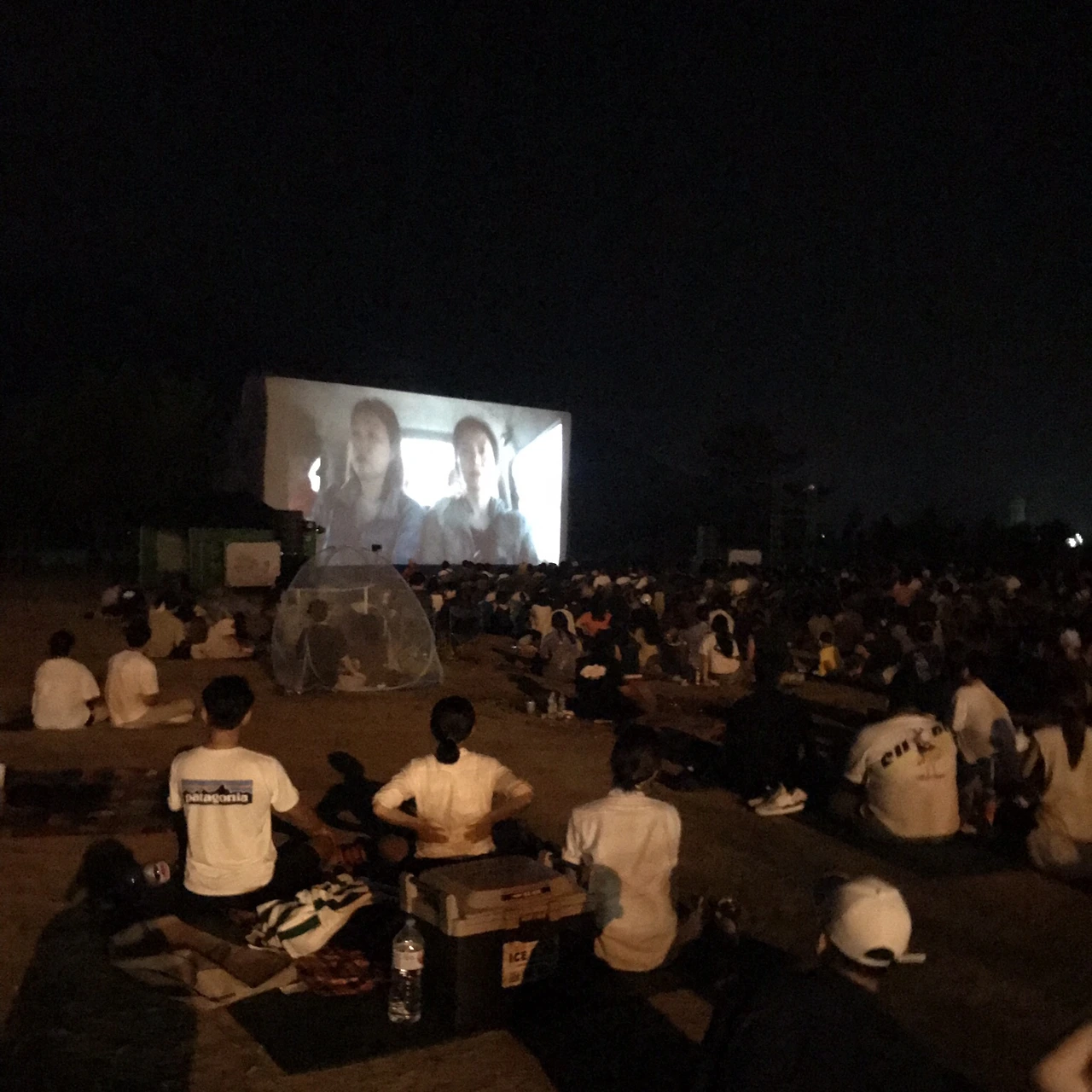 커다란 스크린에서는 영화가 한창이었고 그 앞으로 의자에 앉은 사람들과 돗자리에 누운 사람들과 모기장 텐트 안에 옹기종기 모인 사람들이 있었다. 이 초등학교의 주인으로 보이는 꼬마들도 사이사이 보인다.