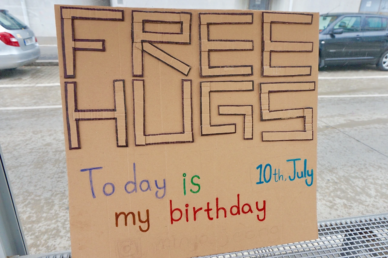 오스트리아 비엔나 하영 언니 집에서 지낸 지 한 달째다. 평소 잠이 많은 하영 언니가 일찍 일어나 부엌에서 요리를 하고 있길래 뭔가 하고 봤더니 미역국이다. 작년 생일에도 먹지 않았던 미역국을 낯선 땅 오스트리아서 맛보게 될 줄은 상상도 못 했다. 미역국을 먹으면서 오늘 뭘 하면 내 생일을 특별한 날로 만들 수 있을까 고민하다가 한 가지 아이디어가 떠올랐다. 집에 있는 상자를 활용하여 FREE HUGS라고 글씨를 쓰고 그 아래 '7월 10일, 오늘은 저의 생일입니다'라고 영어로 적었다. 피켓을 만든 후, 오스트리아에서 가장 유명한 슈테판 성당을 찾아갔다. 성당 입구 앞 중심거리에 서서 용기 있기 피켓을 들고 프리허그를 시작했다.