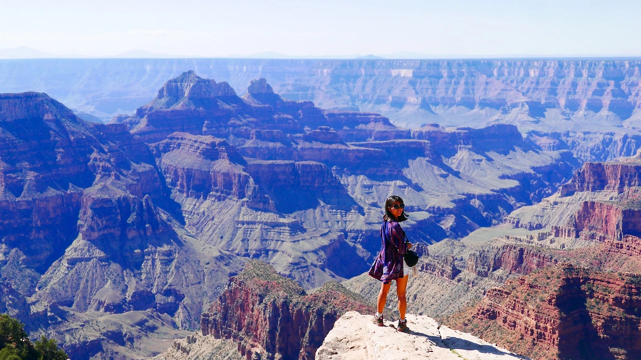 파란색 겉옷을 입은 덕에 옷과 머리카락과 함께 파란옷이 바람에 날려, 더욱 입체감이 살아있는 사진을 찍을 수 있었다. 사우스림에서 바라보던 경치와는 완전히 다른 풍경이다. 노스림에서 보는 풍경은 지구가 격렬하게 숨을 쉬고 있는 듯한 느낌까지 들었다. 해가 중천에 다다르자 세상은 파란 물감을 뿌려 놓은 듯했다. 내 두 눈으로 이 장관을 보고 있다는 사실에 갑자기 소름이 돋으며 이세상에 태어나길 정말 잘 했다는 생각이 들었다. North와 South Rim을 모두 다 보고 나서야 그랜드 캐니언 규모에 대해서 조금 실감이 갔다. 불과 지난주에는 저 멀리 보이는 반대편에 서서 이곳을 바라보고 있었는데 지금은 이곳에서 저곳을 보고 있다. 어떻게 세상에 이런 규모의 협곡이 존재할 수 있는지, 경의를 표하지 않을 수 없었다. 지구의 역사가 살아 숨 쉬는 곳. 너무 광활해서 도저히 상상조차 할 수 없는 그 세월의 규모가 눈앞에 펼쳐져 있으니 몸 둘 바를 모르고 손으로 입을 가리고 감탄할 수밖에 없었다.