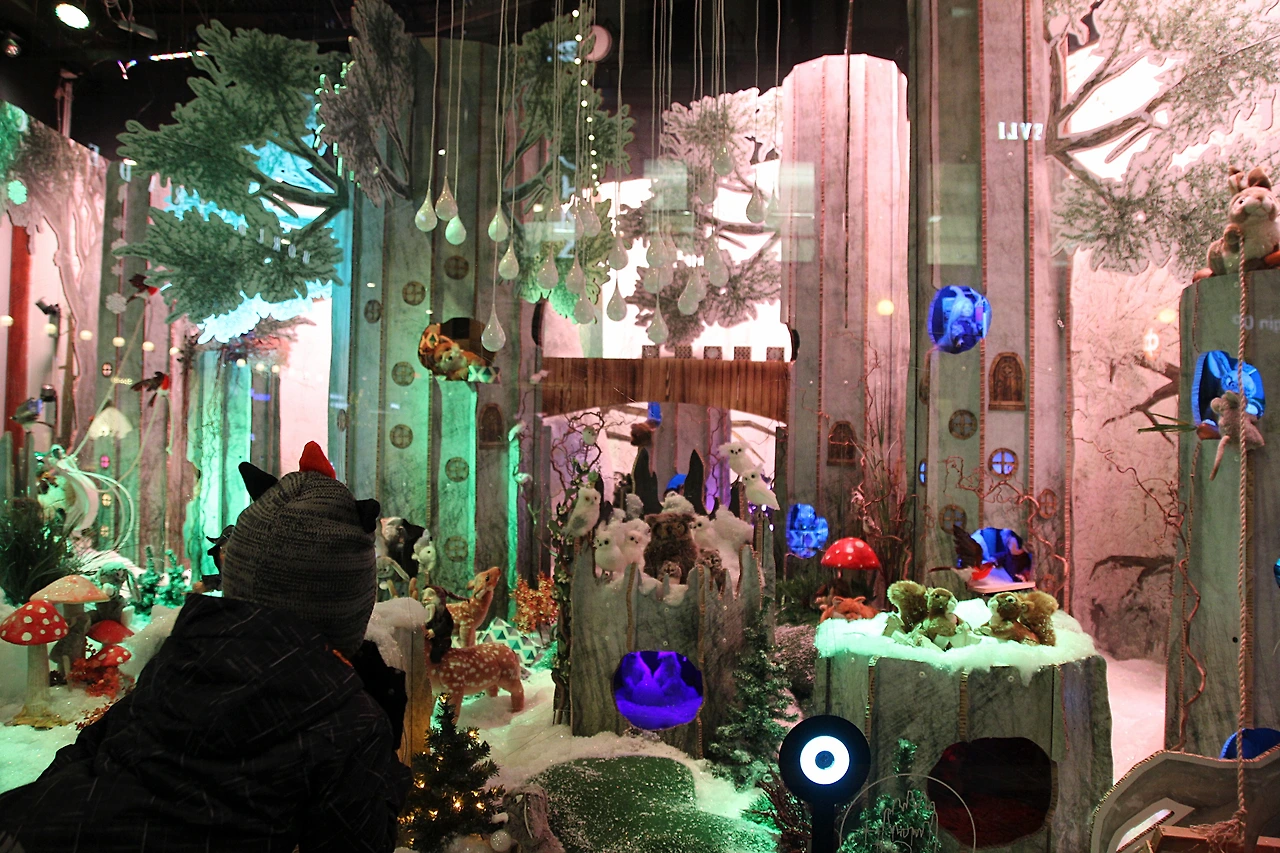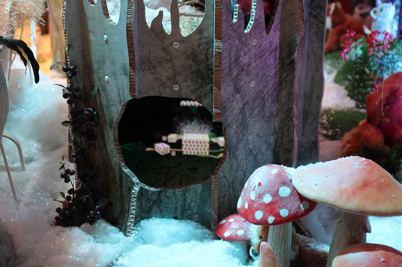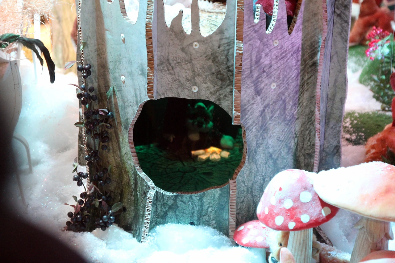 제일 신박하다 생각했던 쇼윈도우. 겨울의 동물들로 가득한 쇼윈도우 안쪽에는 나무 둥치가 안이 비워져 있고, 창문에는 터치형 버튼이 설치되어있다.