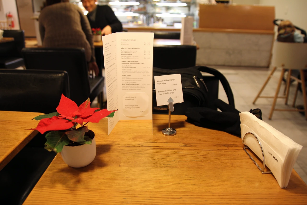 소박한 테이블, 메뉴판은 핀란드어이 기본이고 직원이 눈치껏 외국인에게는 외국인용 일본어&영어 메뉴판이 가져다준다.