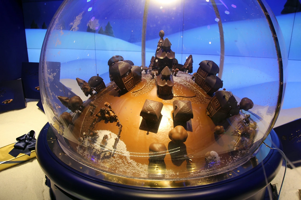 핀란드의 유명한 파제르 쵸콜릿의 쇼윈도우, 아기자기한 마을 모양의 쵸콜릿이 대형 스노우볼 안에 들어가 있다. 이게 빙글빙글 돌아간다.