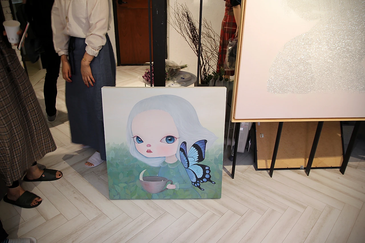 하지만 그림을 살 생각도 전혀 없었고, 방 안에 걸린 그림 중 소장하고 싶을 만큼 마음에 드는 것은 없었다. 그래서 그대로 1층으로 내려가 행사에서 무료로 제공하는 프리 드링크를 한 병 마시고 자리를 떠날 생각이었다. 그런데 아는 사람들이 눈에 들어오고 인사를 나누고 이야기를 하다 보니 어느새 나는 1층 소파에서 문승연 작가님과 단둘이 앉아 도란도란 작품 이야기를 나누고 있었다. 방금 방에서 봤던 작품들 중에는 원하던 느낌의 그림이 없었다고, 나는 눈 화장이 예쁜 아이가 가지고 싶다고 이야기했더니 작가님은 반색하며 자신의 핸드폰에서 이 작품의 눈 화장이 예쁘다며 그림을 하나 보여주셨다. 그게 바로 블루 버터플라이였다. 작가님은 마침 이 작품은 바로 보여줄 수 있다며, 창고에 있는데 꺼내볼까요? 하고 창고에 가서 바로 이 작품을 꺼내 주셨다.