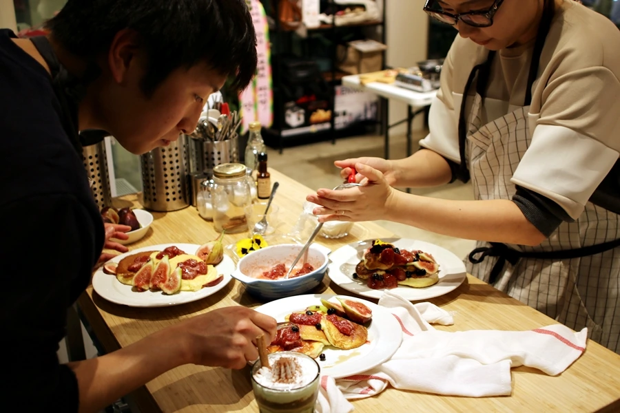 제이디 셰프님이 진행하는 쿠킹클래스의 남다른 점이라면, 테이블 웨어와 푸드 데코레이션이 트렌디하다는 것이 아닐까. 실제 현업에서 일하는 그 센스가 십분 발휘된 테이블 웨어와 플라워 디자인은 물론이고 실제로 맛과 밸런스를 고려하여 준비된 데코레이션 재료들은 상남자인 남자 친구도 두근거리게 만들었다. 남자 친구는 호쾌하게 시럽만 뿌려 먹겠거니 하고 예상한 것이 무색할 정도로 남자 친구는 데코레이션에 엄청난 시간을 들였다. 셰프님이 만들어 둔 예시를 열심히 참고하면서 고민하는 그 모습에 남자 친구의 새로운 모습을 발견할 수 있었다.