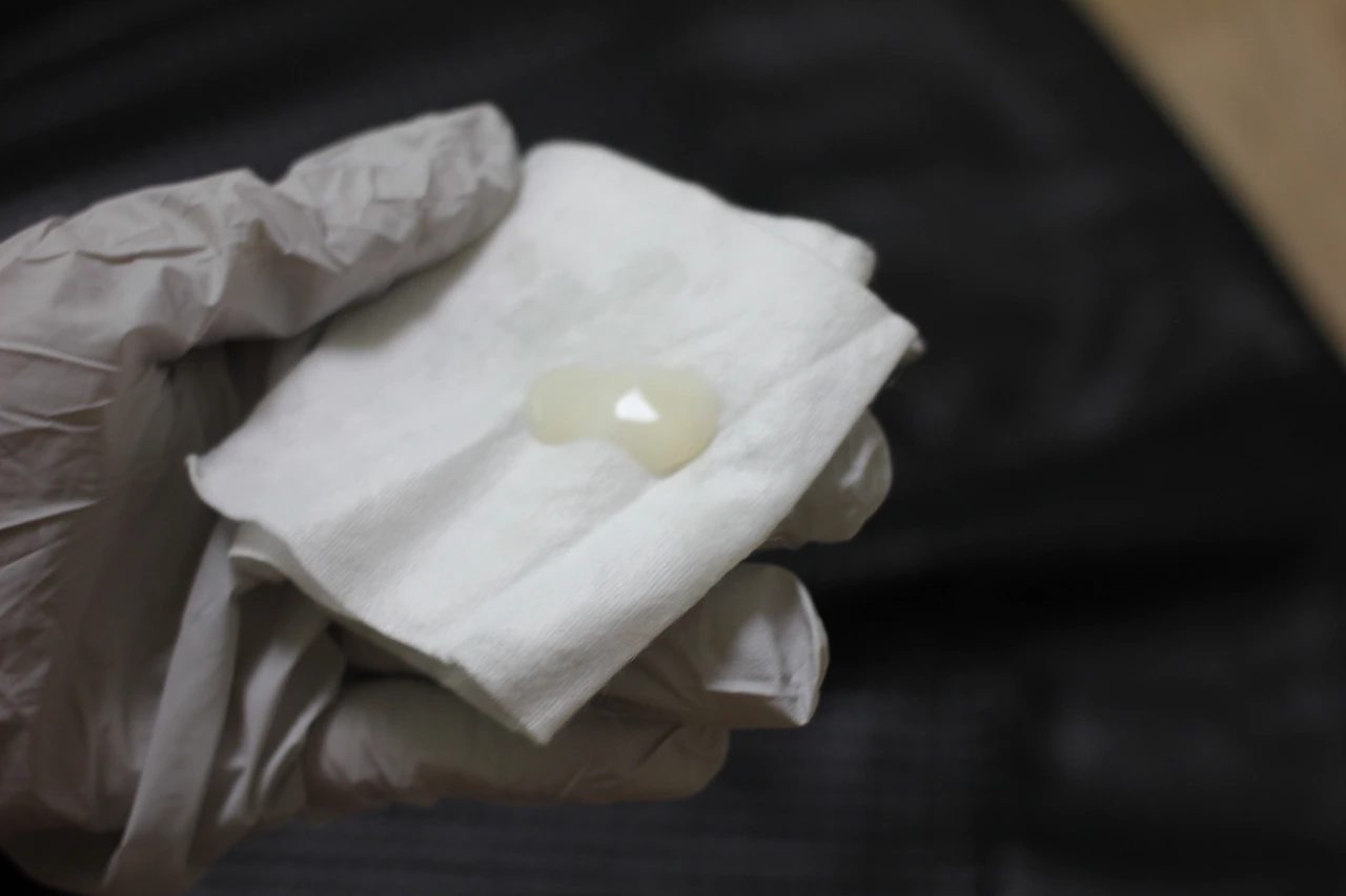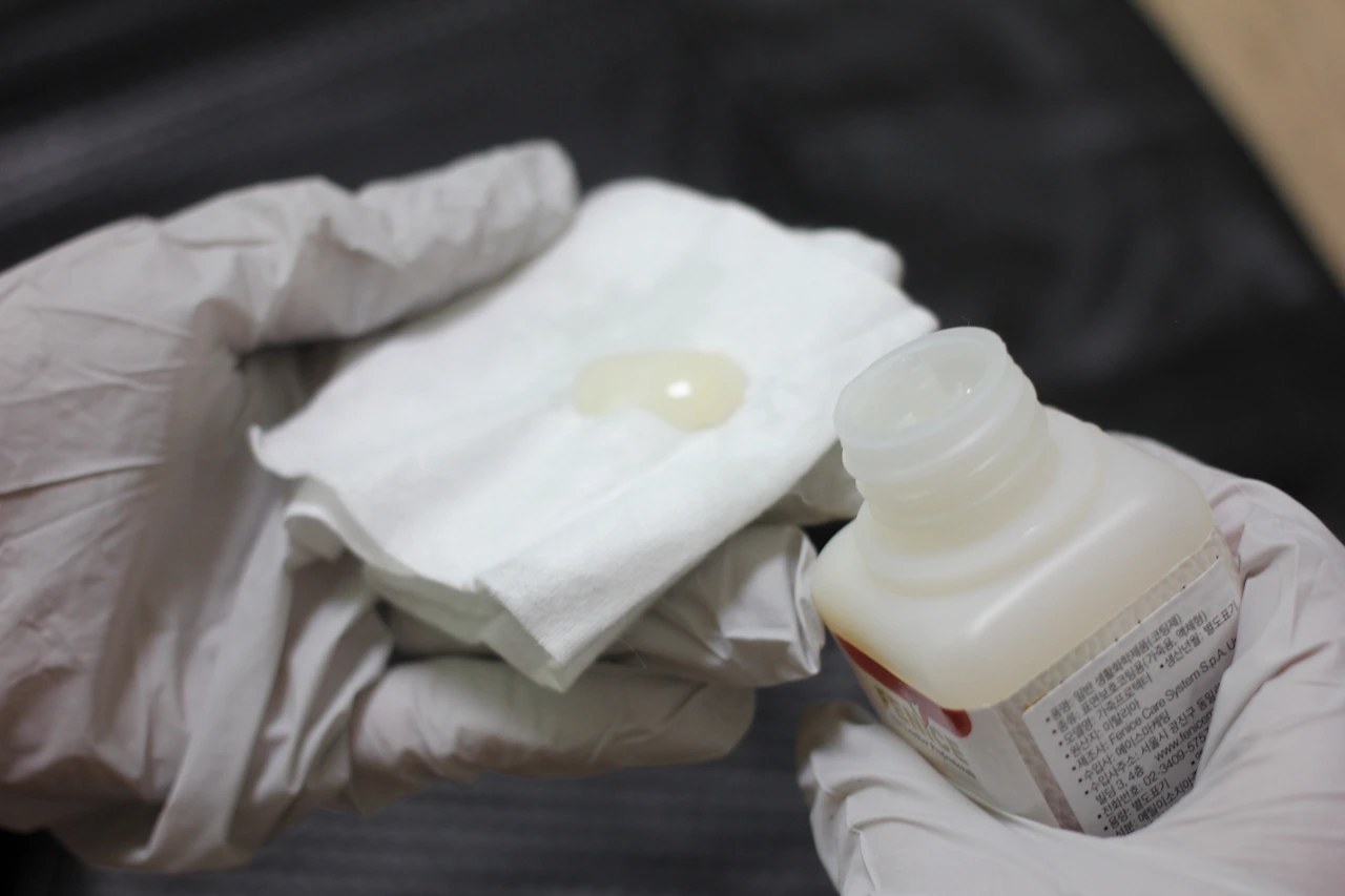 장갑을 끼고 키트에 동봉된 천을 가위로 잘라, 약을 짜서-