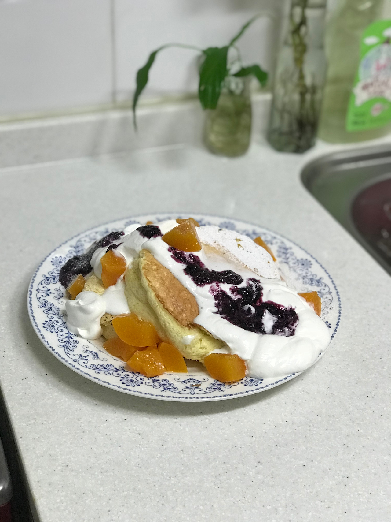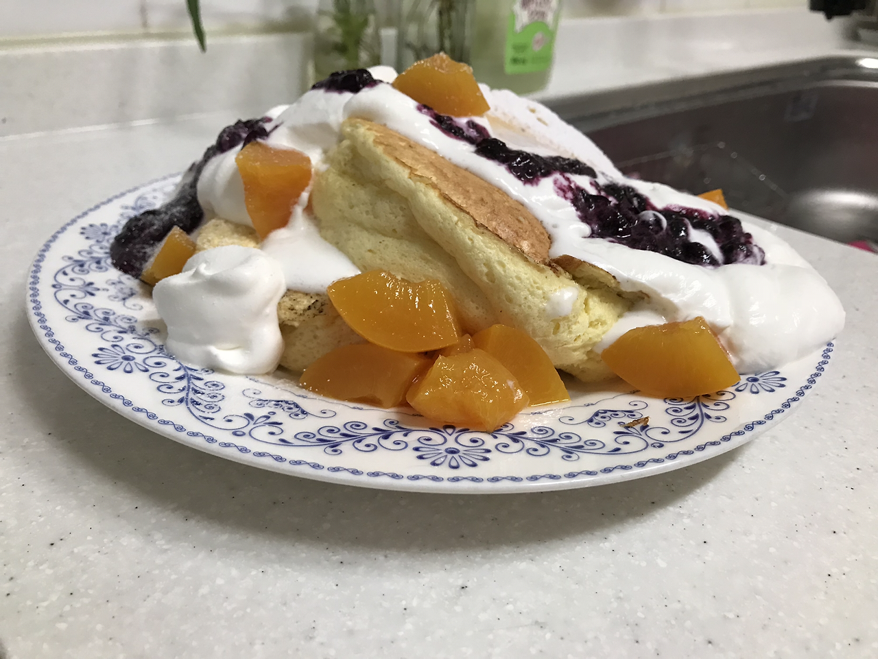 친구와 저녁으로 수플레 팬케이크를 해먹었는데 바닐라향이 나는 시럽을 뿌리거나, 바닐라 향을 반죽에 첨가해야하는 듯 해요.