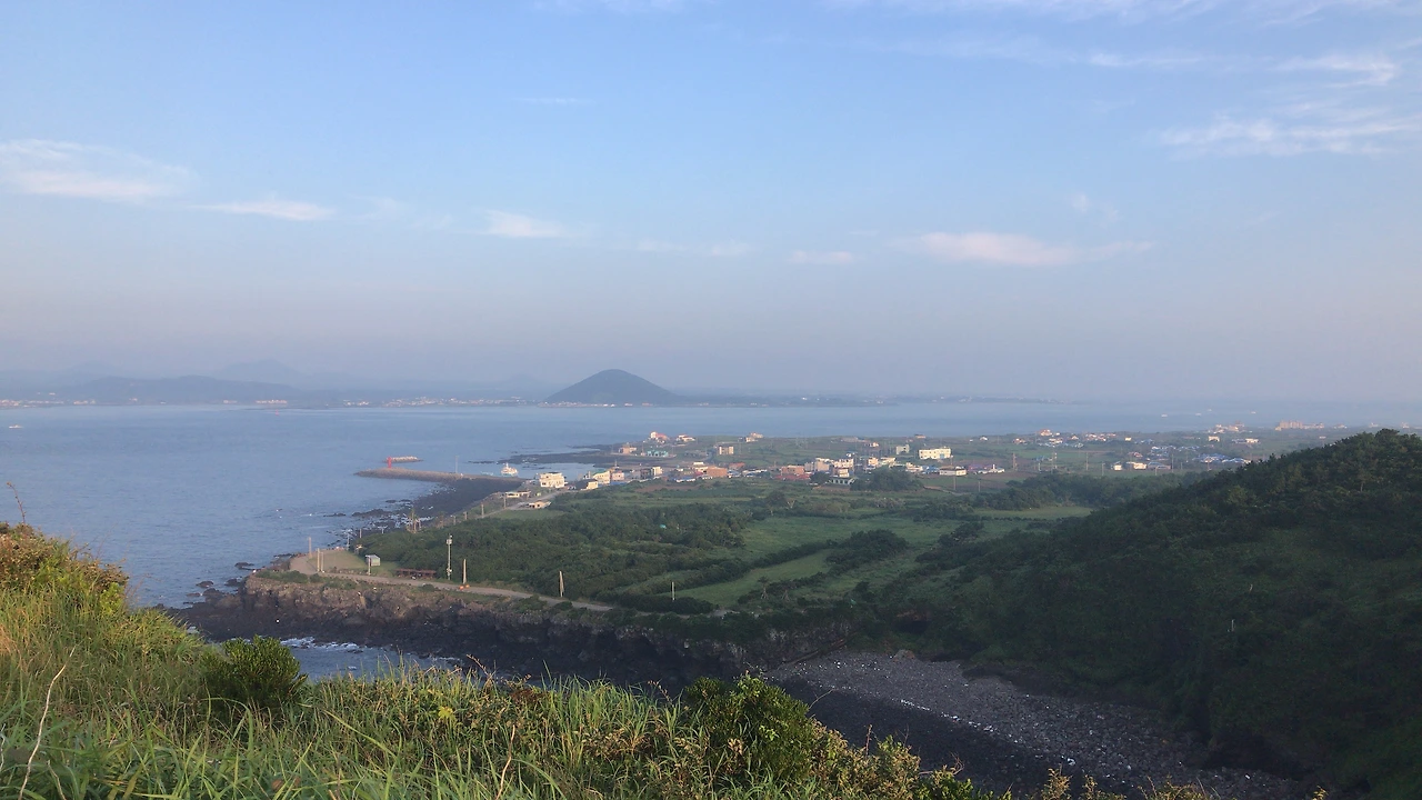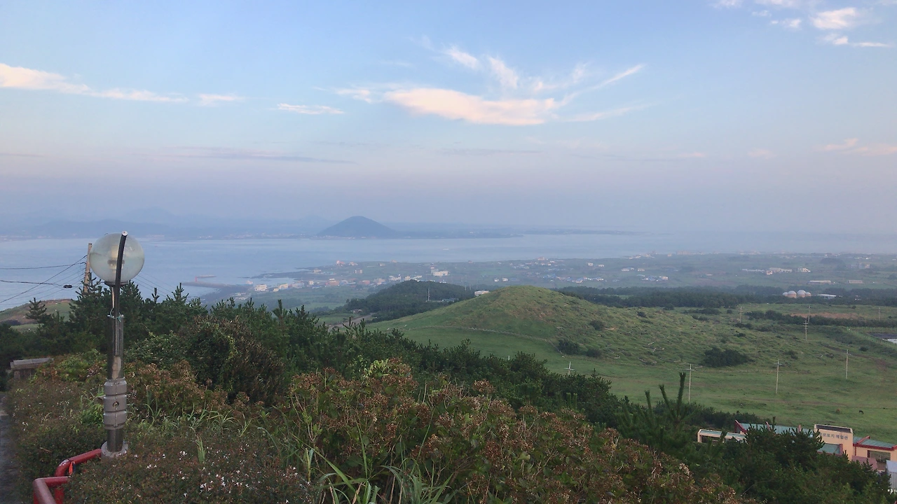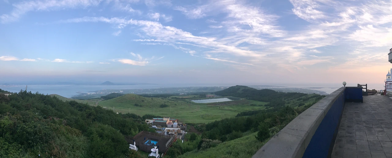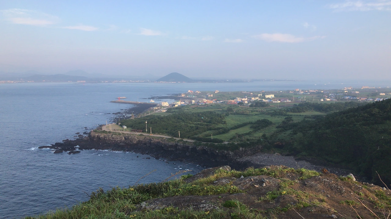 유럽인가 착각이 드는 목가적인 풍경을 등지면, 푸르른 바다 건너 제주도가 보인다.