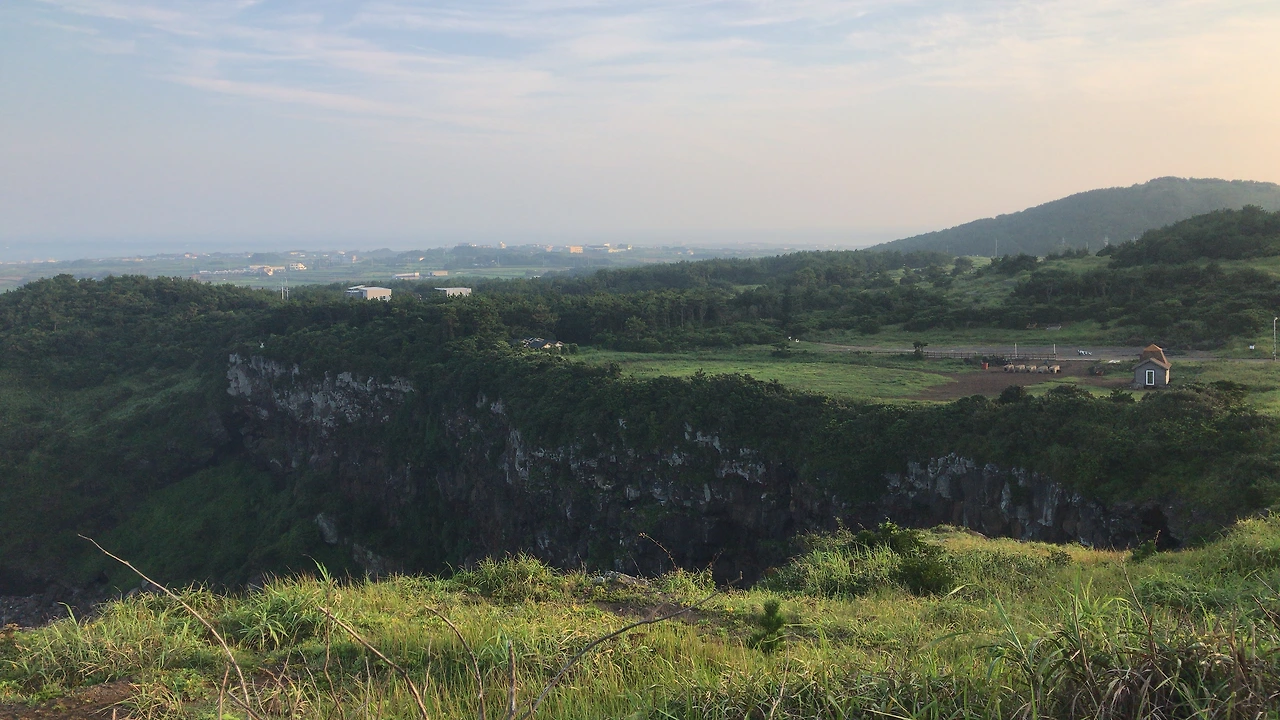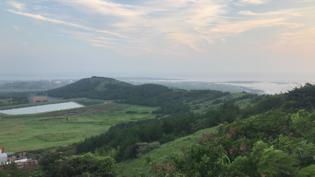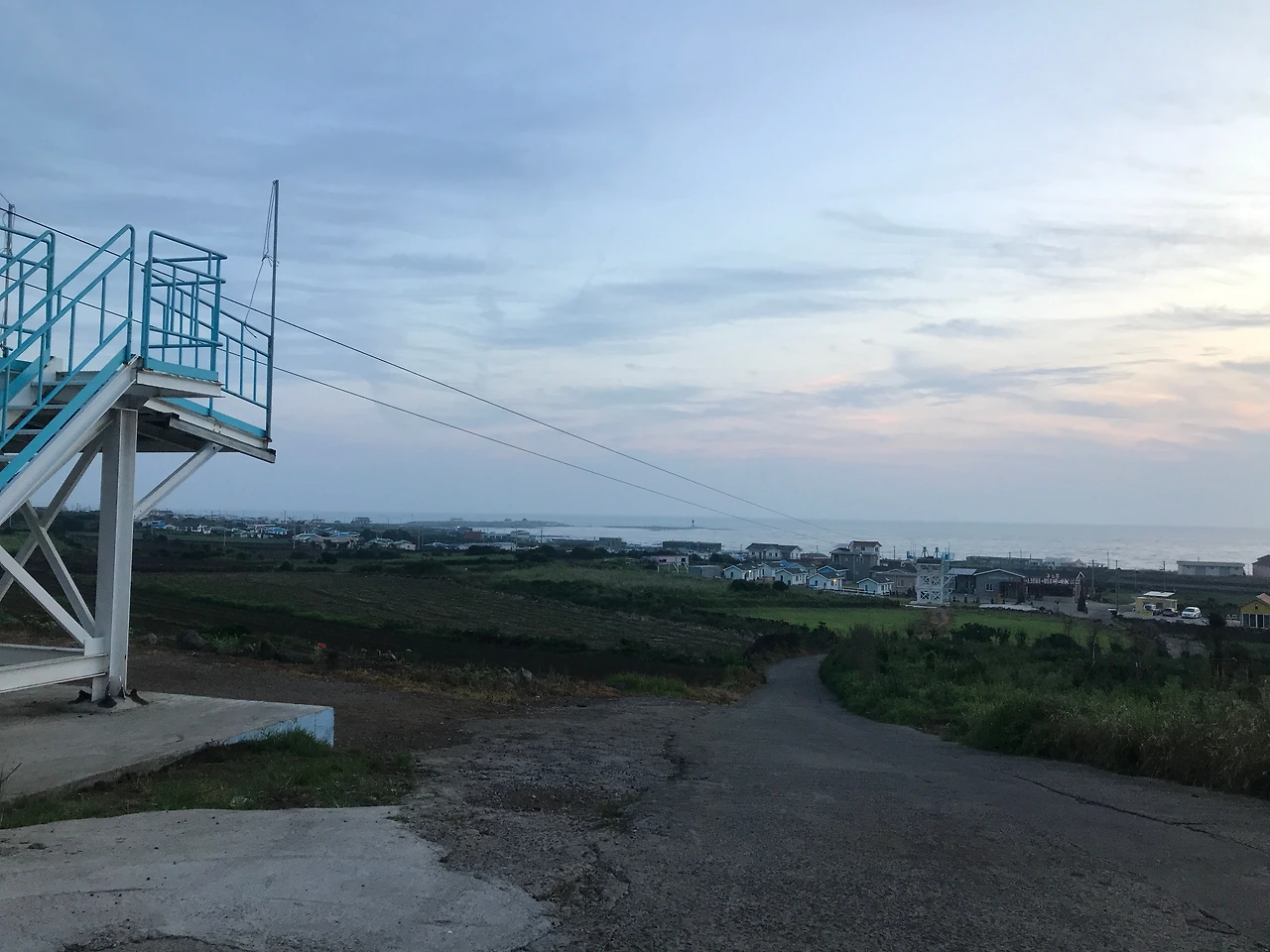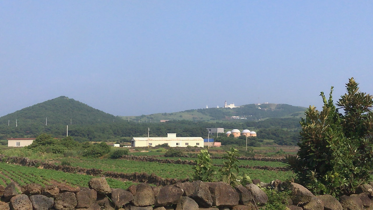 유럽인가 착각이 드는 목가적인 풍경을 등지면, 푸르른 바다 건너 제주도가 보인다.