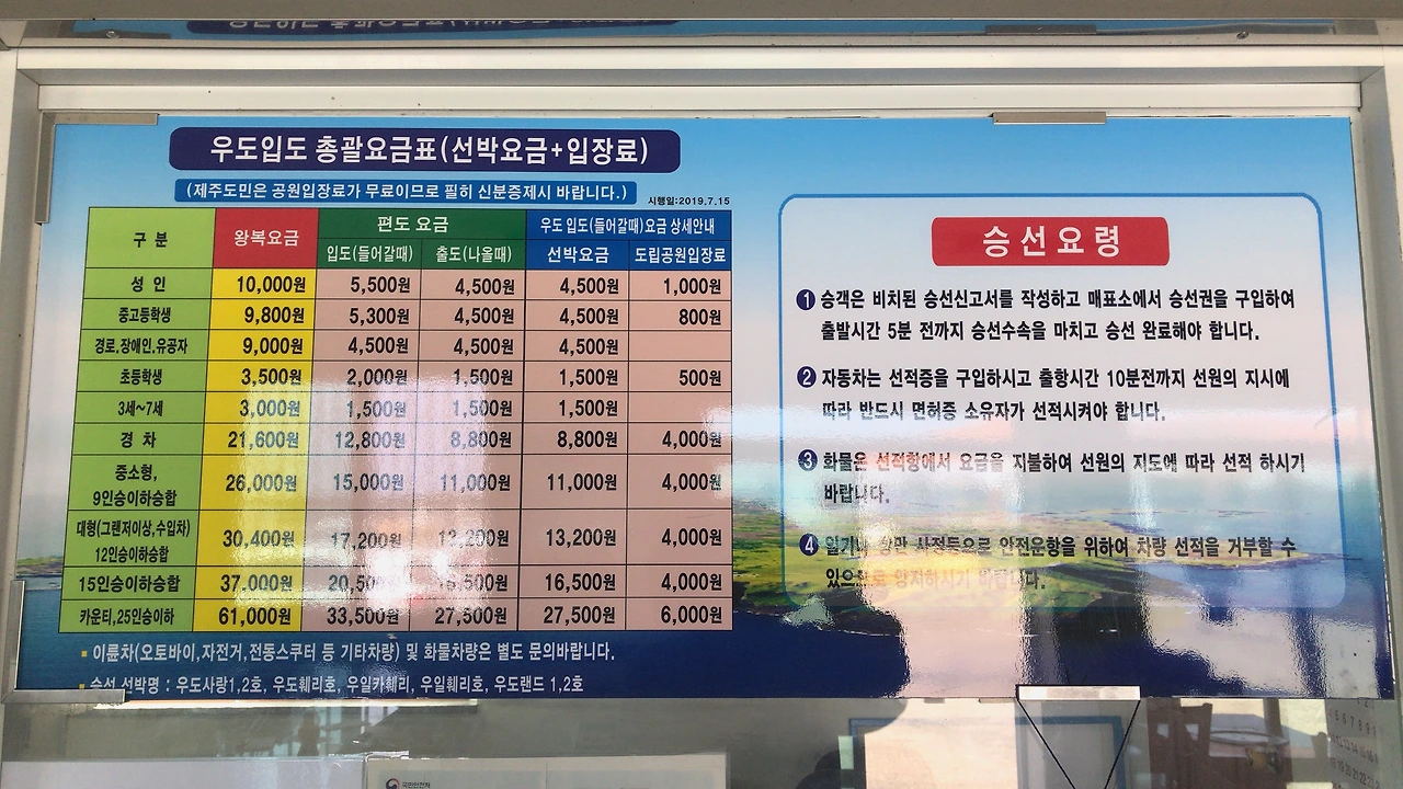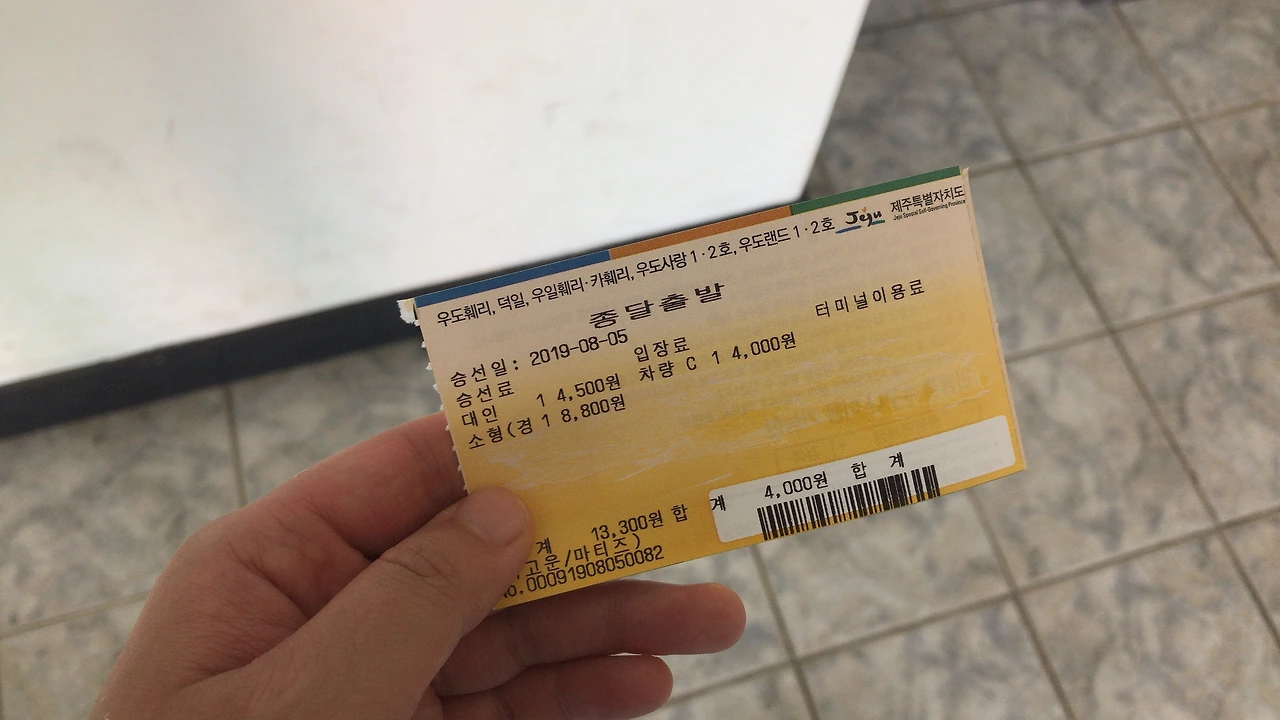 나는 제주도민이라 입장료를 뺀 성인 편도 4500원, 그리고 마티즈는 소형 경차라 12800원과 차량 입장료 4000원 (우도 주민이라면 무료라고 한다.) 우도 입도 시 금액은 17300원.