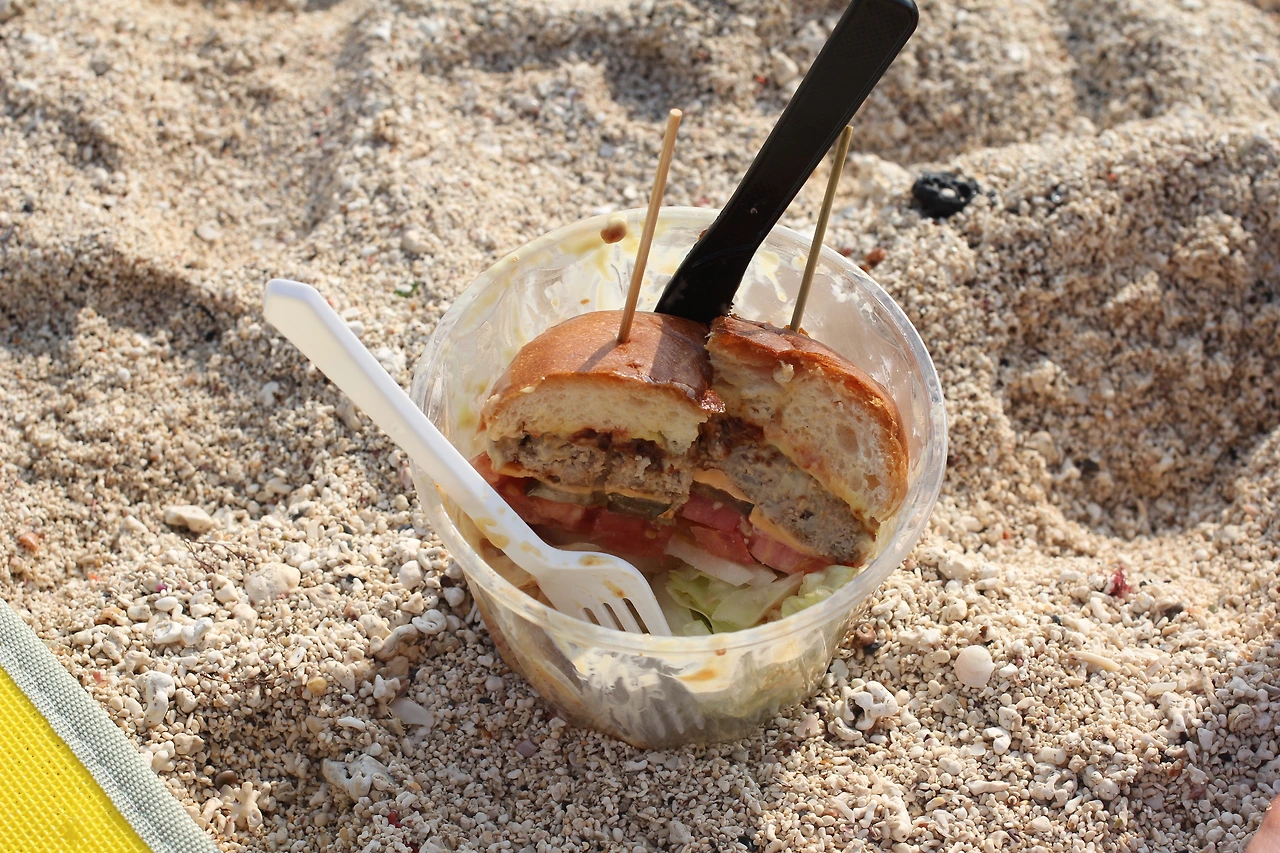 오후 4시 반쯤 도착한 서빈백사는 주차장의 자리가 하나둘씩 나고 있었고, 무사히 주차를 하고 해수욕장으로 달음박질쳐서 내려갈 수 있었다. 많은 가족들이 자녀들과 함께 헤엄치고 있었고 뒤편에서는 해수욕장의 안전을 책임지는 청년들이 간이 노래방 마이크로 노래를 부르고 있었는데, 아무래도 음치인 모양인지 음이 불안하고 고음 부분에서는 자기들끼리 킥킥거리는 소리가 더 크게 들려왔다. 이제까지 잘 관리되던 제주도의 다른 해수욕장을 가다가 소박한 즐거움에도 낄낄거리는 동네 해수욕장(이라고 하기엔 너무 유명한 곳이지만) 청년들의 어설픈 라이브를 들으며 하하호호의 햄버거를 먹어치웠다. 더운 날씨에 상할까 걱정되는 마음에 급하게 입에 햄버거를 밀어 넣었는데 특별나게 뛰어나진 않지만 신선한 재료와 맛있는 패티가 잘 어우러진 햄버거였다. 하지만 다음에 또 간다면 매장에서 먹을 것이 아니라면 우도 롯데리아의 햄버거를 사서 해변에서 먹을 것 같다.