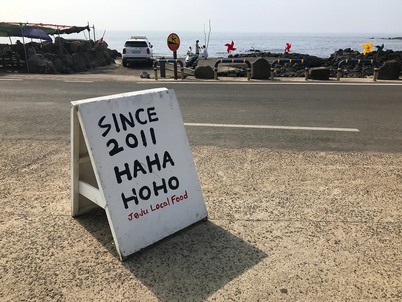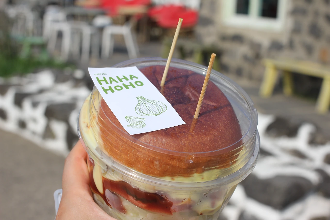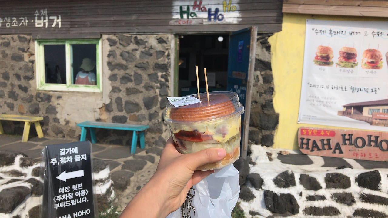 뜨거운 물이 펑펑 나와서 기분 좋게 샤워를 하고, 수영복으로 갈아입고 그 위에 옷을 걸친 후에 숙소를 나섰다. 체크인하면서 직원분에게 청천벽력과도 같은 소식을 들었는데 내일 태풍주의보 때문에 오전 9시까지만 배가 뜬다는 것이었다. 심지어 나는 차를 가져왔기 때문에 탈출하려면 오전 7시에 채비해서 출발하는 것이 좋겠다고 했다. 여유롭게 스케줄이 허락된다면 이틀 정도 우도에서 지낼 생각이었던 나는.... 바로 하하호호로 버거를 먹으러 가기로 했다. 첫 번째 우도 방문 때는 솔드 아웃되어서 먹지 못했었기 때문에 섬을 둘러보며 들렸었는데, 엄청난 웨이팅에 질려서 사람이 적을 내일 오전 중에 사 먹으려던 참이었다. 하지만 태풍이 오면 모든 가게가 문을 닫는다는 직원분의 조언에 급하게 일정을 변경했다. 우선 햄버거를 포장하자!