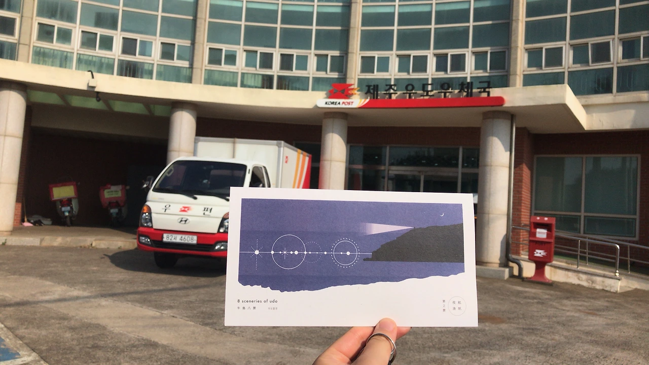 제주도 우도 우체국. 직원 두 분이 계신 조그마한 우체국이다. 정말 여유롭고 한가한 모습인데 최신식으로 잘 정돈된 모습이 낯설었다. 친절하신 직원분이 내가 받을 주소를 누락한 걸 알려주셨다. 우편 요금은 470원.