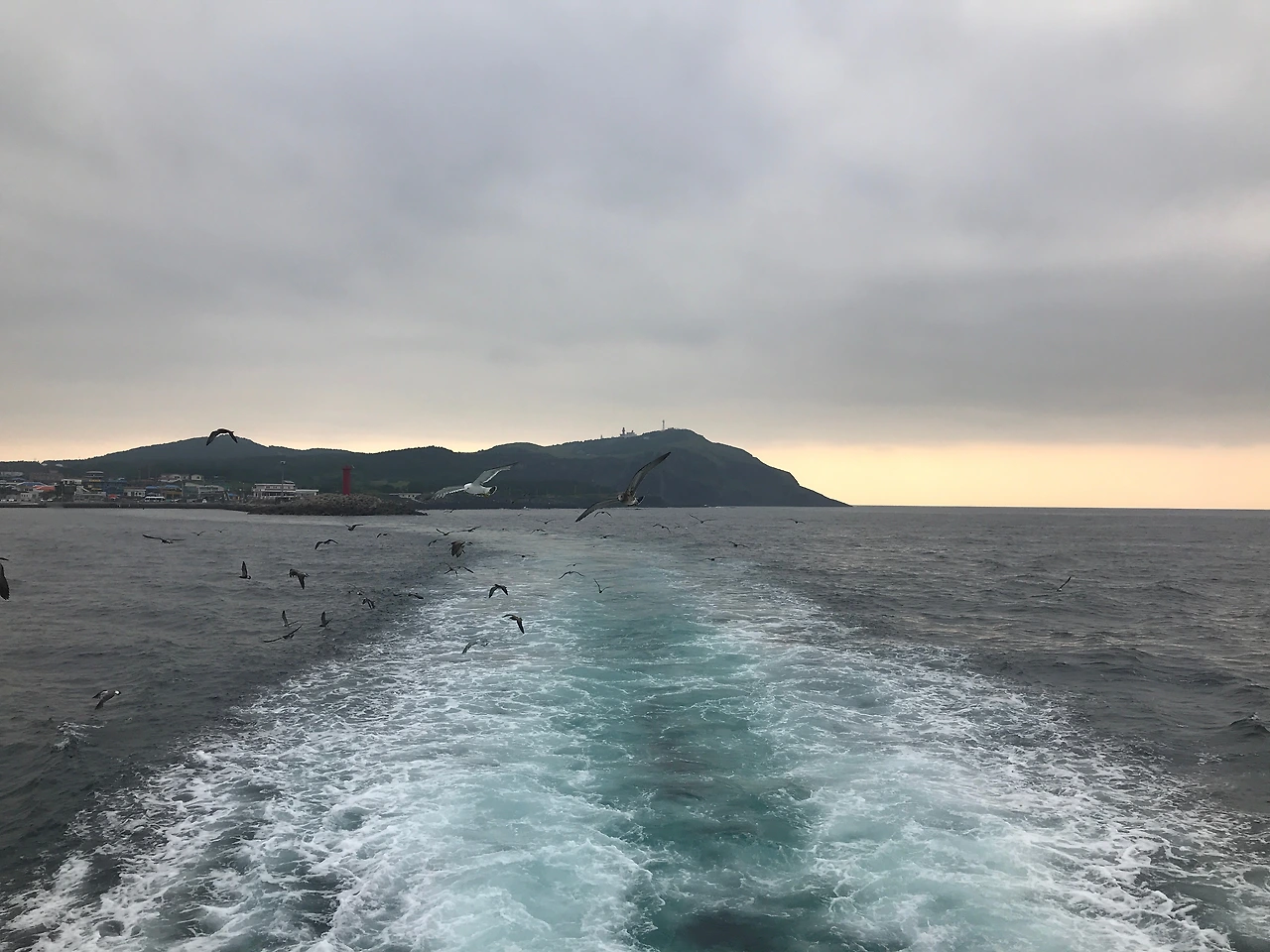 천진항에 도착하자마자, 태풍주의보 때문에 다음배가 언제가 될지 모른다며 빨리 출발하라는 직원분의 말에 우선 급하게 배에 차를 실었다. 그리고 배에서 우도를 바라보니 우도봉을 오를 때까지만 해도 파랬던 하늘에 먹구름이 가득했다. 거친 파도에 배가 출렁거렸다. 올 때는 낌새도 없었던 멀미가 울렁울렁 올라왔다.