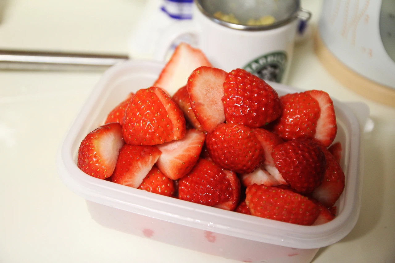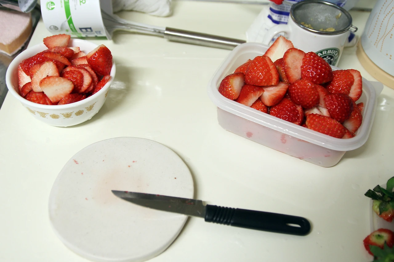 그리고 두 팩 사온 딸기를 정성껏 다듬는다. 그 과정에서 물러서 모양이 안 예쁜 애들은 왼쪽, 예쁜 애들은 반쪽으로 잘라 오른쪽으로 나눈다.
