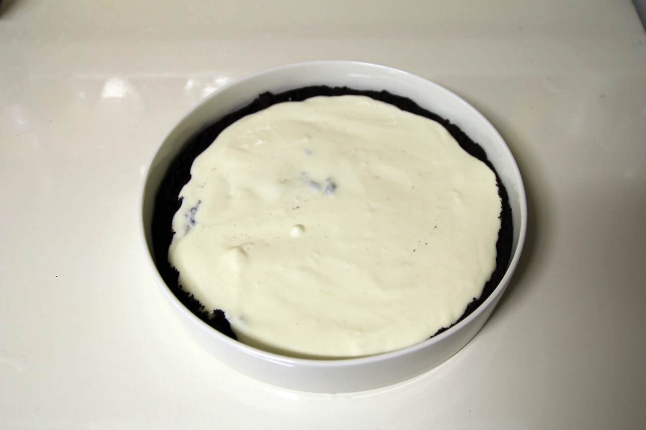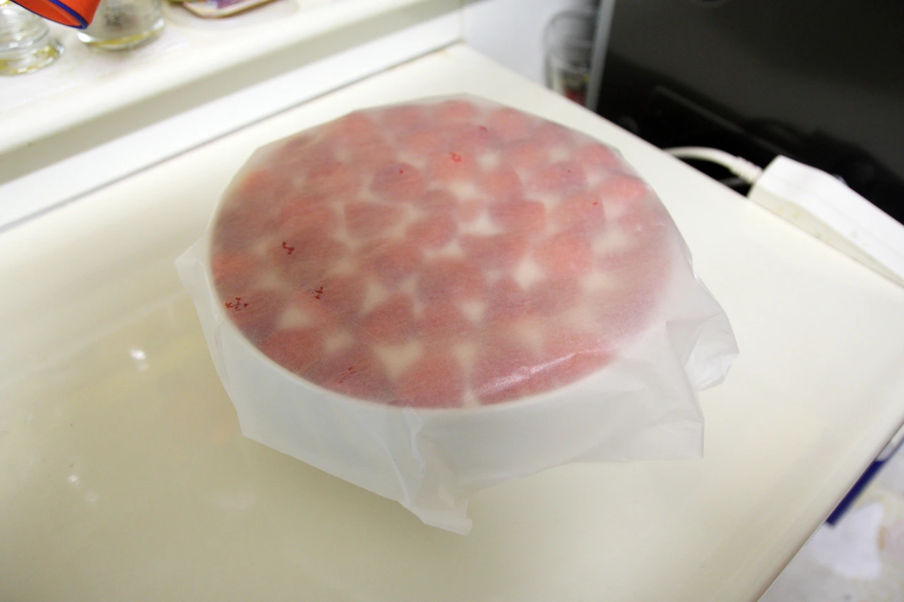 유산지를 씌워 마무리. 이대로 냉장고에 넣어 굳혀도 좋지만, 그럴 경우에는 랩핑을 한 번 더 하거나 비닐봉투에 넣어 봉한 다음 굳히는 것이 좋다. 냉장고 안에서 굳히는 동안 반찬이나 다른 냄새가 배어 날 수 있기 때문에 집에서 제과를 하는 경우에는 꼭 잘 봉할 것. 기왕 만든 케이크에서 마늘 냄새가 나거나하면 오던 식욕도 도망갈 수 있다.