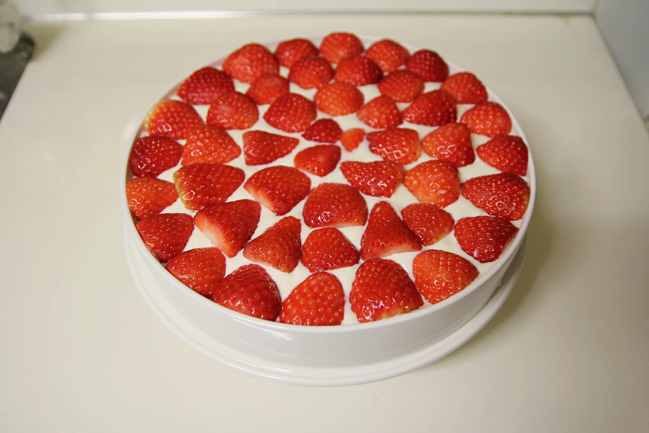 셀프 생일 케이크이니까, 스패츌라로 적당히 표면을 정리하고 이제 아까 오른쪽으로 분류했던 예쁜 딸기들을 케이크 위에 장식한다.