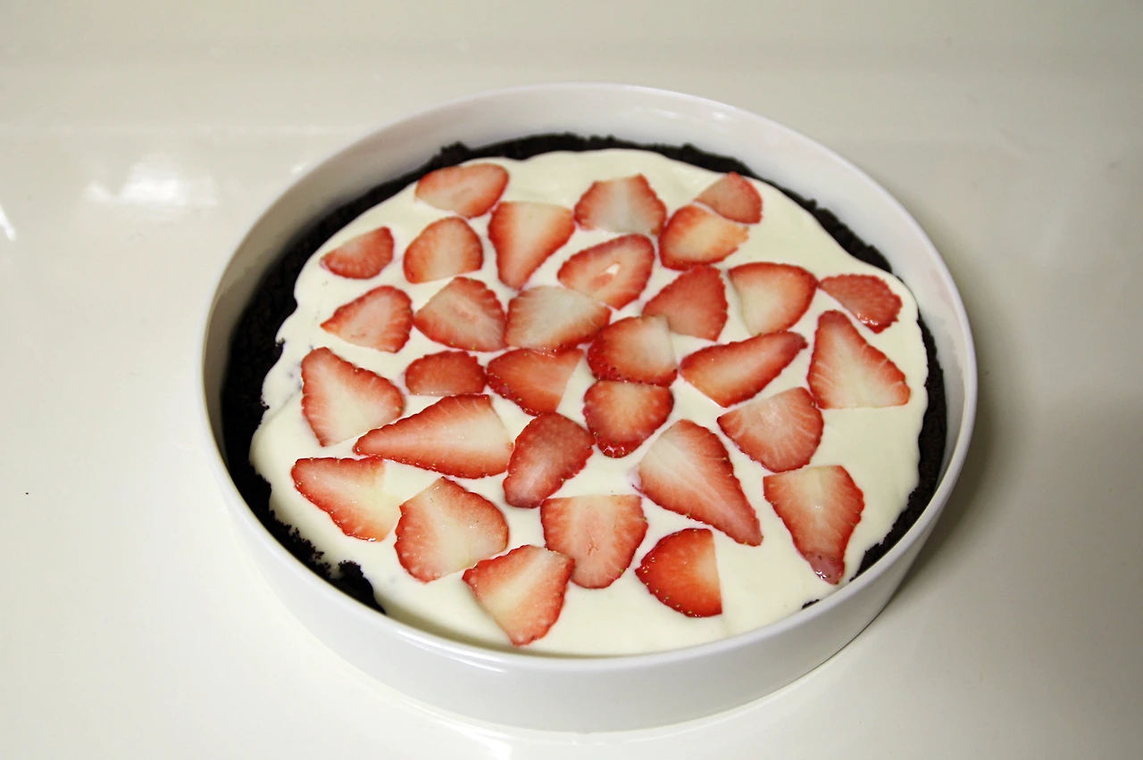한 번에 파악! 다 부으려고 하지 말고, 얌전히 살금살금 스패츌라로 양을 조절해가며 골고루 부어준다. 버터를 안 섞었더니 오레오 쿠키가 밀려나고 난리도 아니다. 하지만 그래서 일부러 얇게 바닥을 깔았으니 당황하지 말고 다음 단계 중앙에 딸기를 한번 깔아준다.