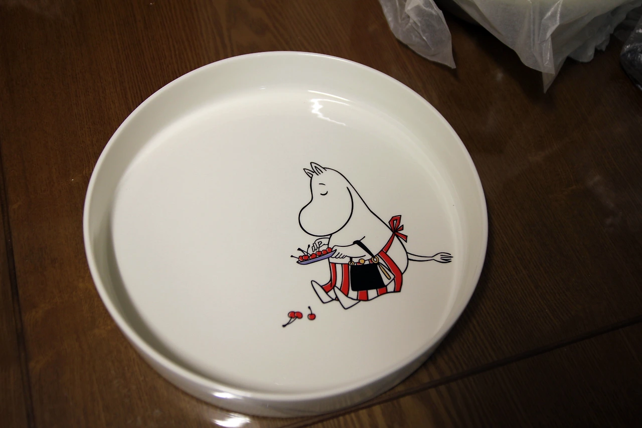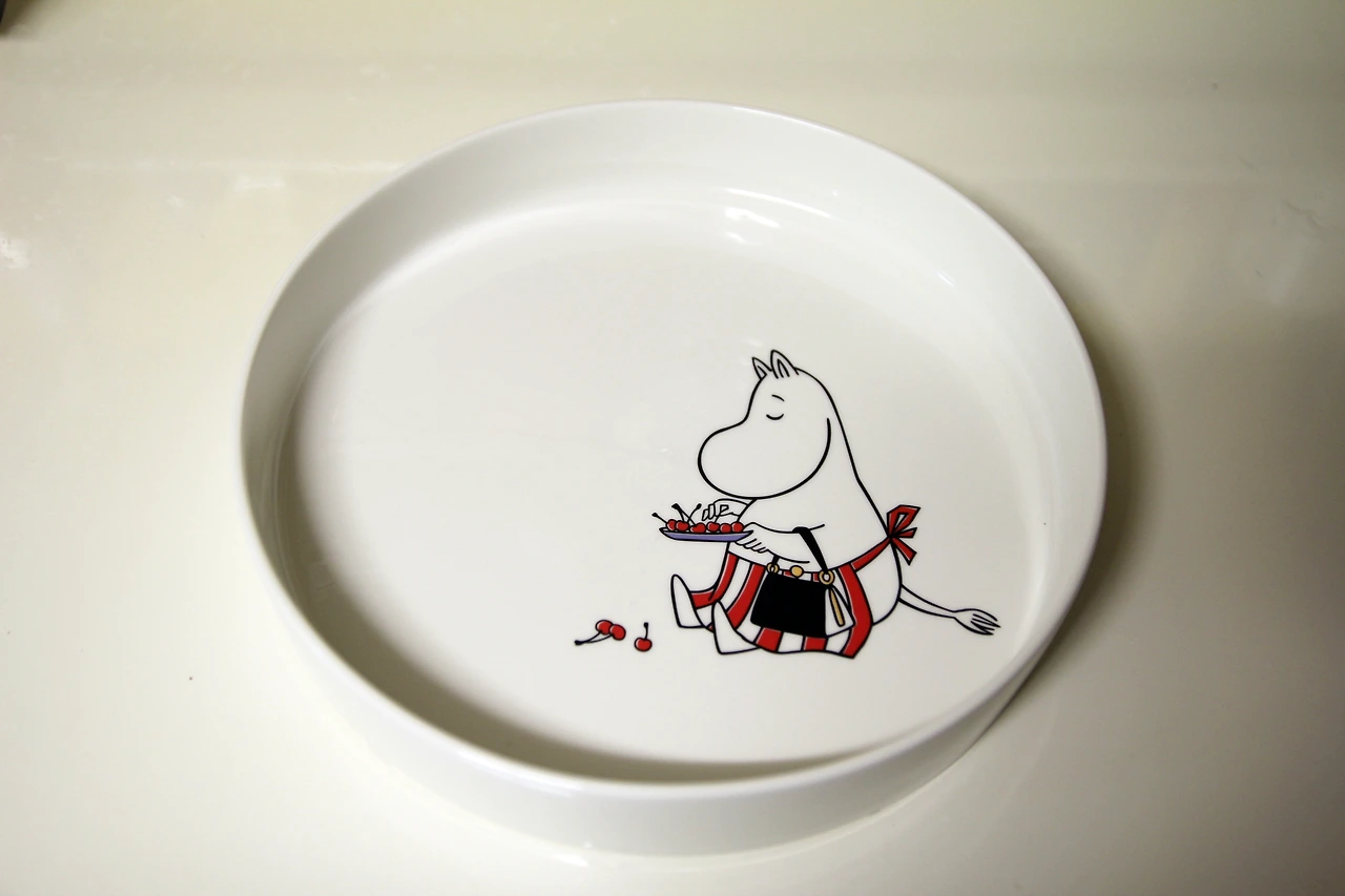 무민이 삼단 체리 케이크를 들고 도망가는 모습이 그려진 케이크 받침대에 딸기 요거트 치즈 케이크를 올린다.