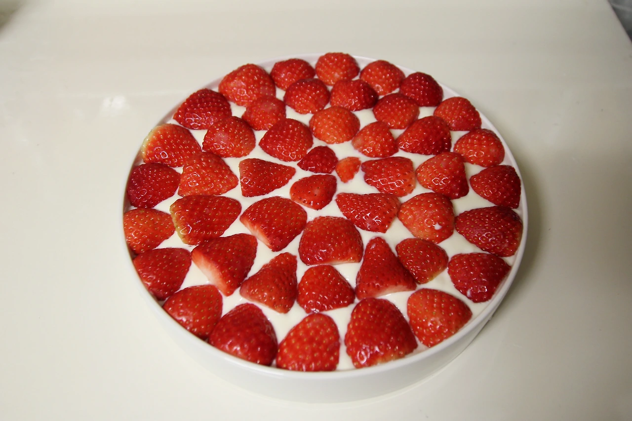 그리고 아까 왼쪽에 분리했던 조금 무른 딸기들은 얇게 슬라이스 해서 필링 위에 깔아준다. 너무 무른 애들은 물이 나와서 필링이 상할 수도 있으니 그런 건 입으로 쏙 넣어주면 된다. 그리고 남은 필링을 부어서 타르트 틀 0.5센티 정도를 남기고 다 채워준다.