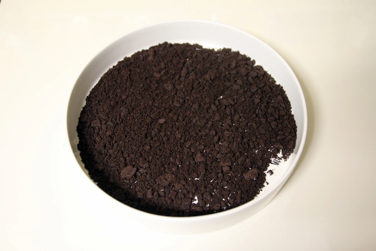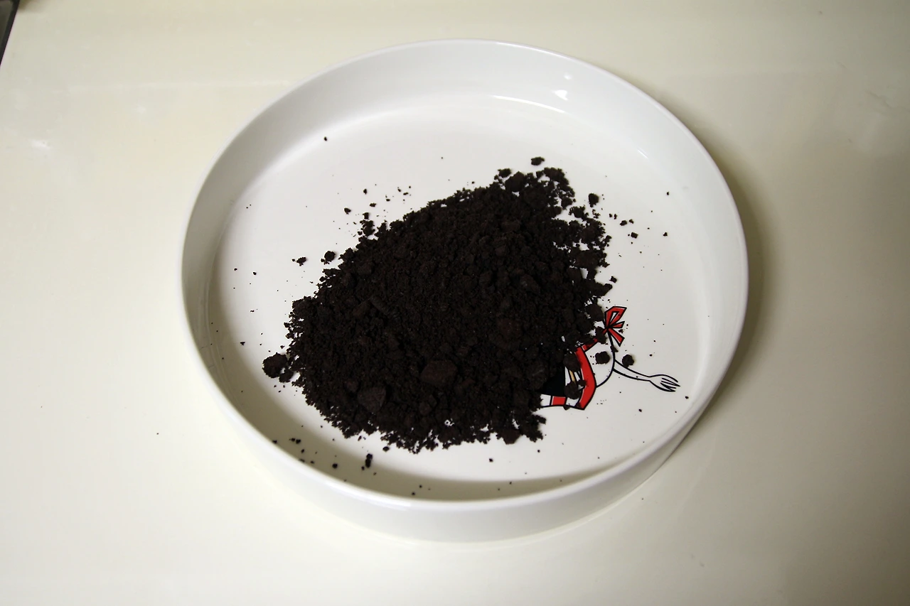 그러면 오레오 쿠키 가루가 모래처럼 산만하게 있을 테니 그릇을 흔들어 균등하게 그릇에 퍼지게 한다. 그리고 부족한 부분에 가루를 더 부어서 채운다. ( 버터를 섞을 경우에는 스패츌러로 꾹꾹 눌러서 펴준다. )