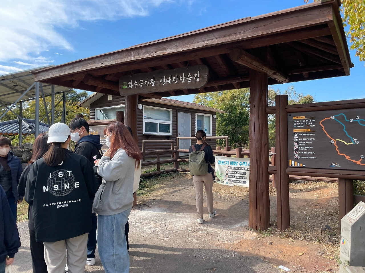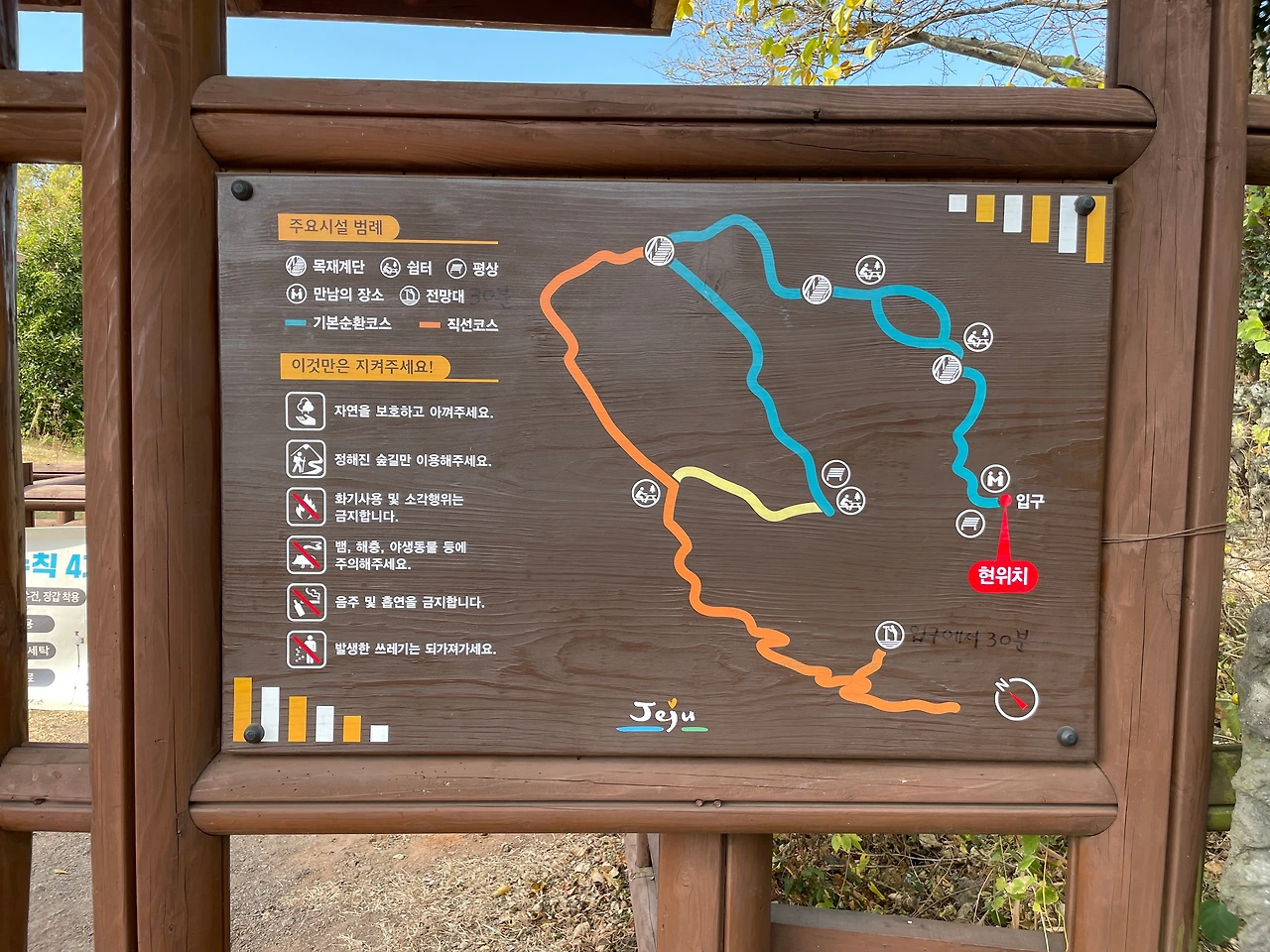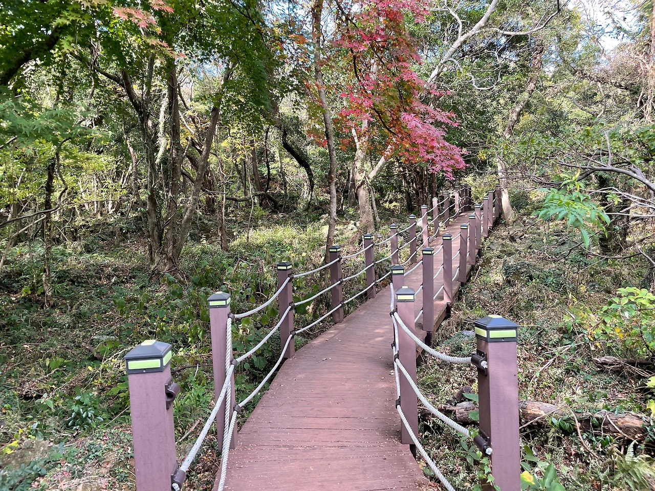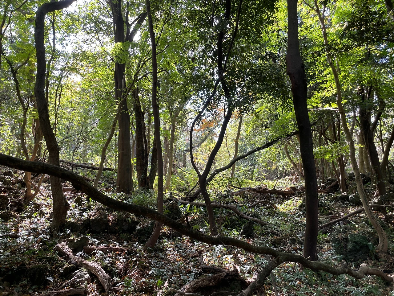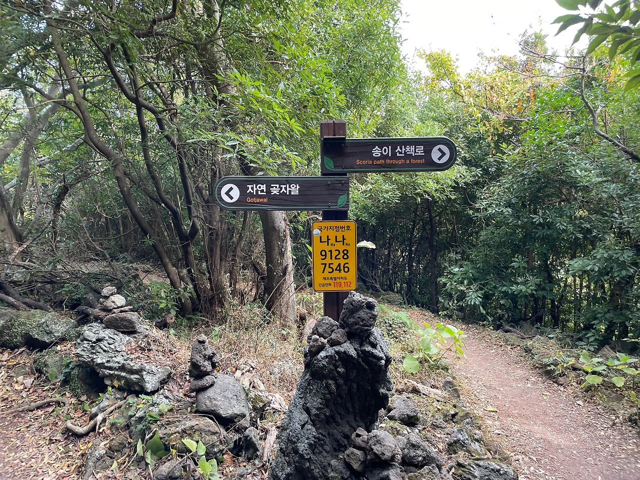 중간에 갈림길이 나오는데 예쁜 것은 자연 곶자왈 길이 맞지만 돌이 너무 많아 발이 아프다. 등산화가 아니라면 송이 산책로를 추천한다.